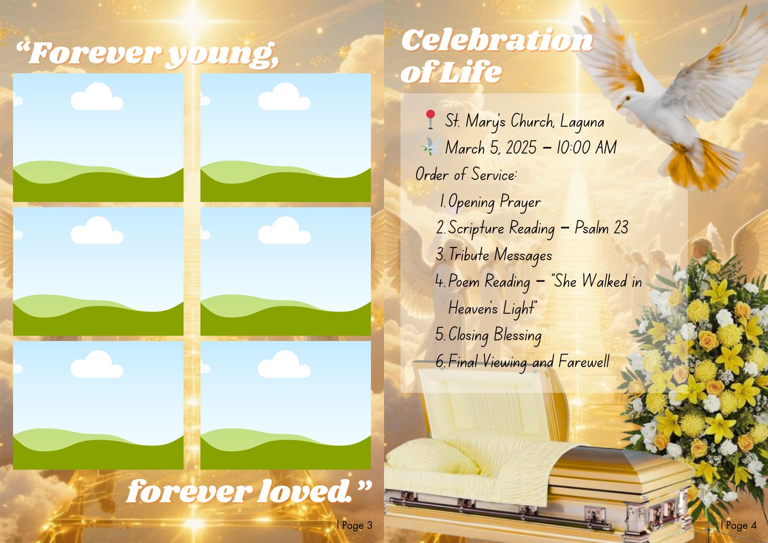 With soft golden hues and elegant layouts, this memorial magazine brings comfort and light to every page โ a heartfelt way to say goodbye and remember a beautiful soul.