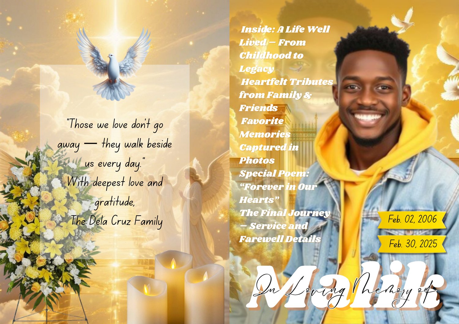 Let your loved oneโs light continue to shine through this yellow memorial magazine template โ a heartfelt keepsake that radiates warmth, peace, and everlasting love.
