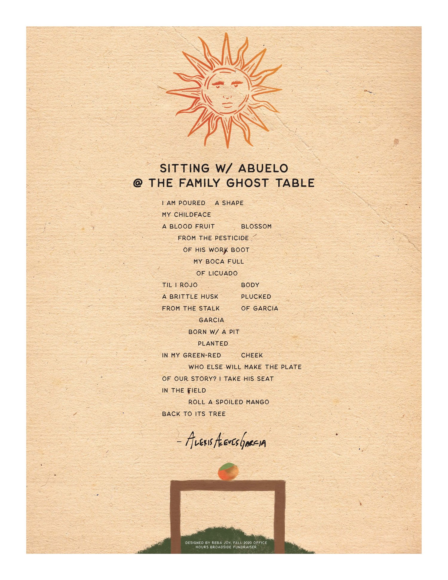 "Sitting With Abuelo @ the Family Ghost Table" broadside with poem by Alexis Aceves Garcia and artwork by Reba Joy Size 8.5" x 11" vertically-aligned. All shipping and handling included in the purchase.
