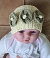 This easy knit Beanie has a 1x1 rib brim then is worked in easy stocking stitch and is adorned with three beautiful contrasting flowers. The flowers can be sewn along the lower edge or together in a cluster.
