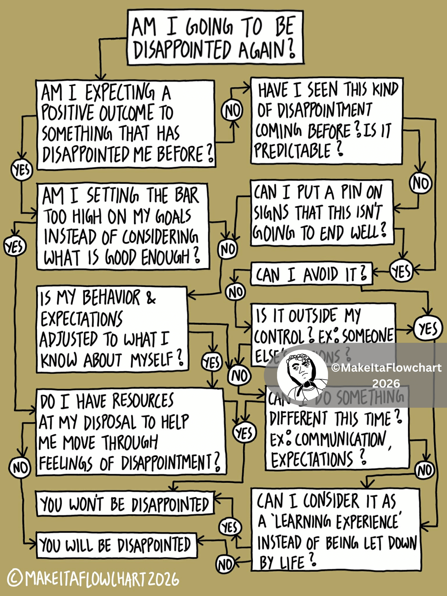 Printable version of the flowchart "Am I going to be disappointed again?" to help you in decision making and save time from constant overthinking.