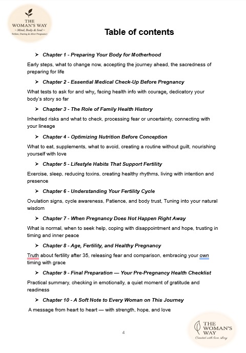 A 14-page beautifully designed PDF — including the cover page, dedication, table of contents, and Chapter 1 from Volume 1 of The Woman’s Way – Mind, Body & Soul: Before, During & After Pregnancy.
