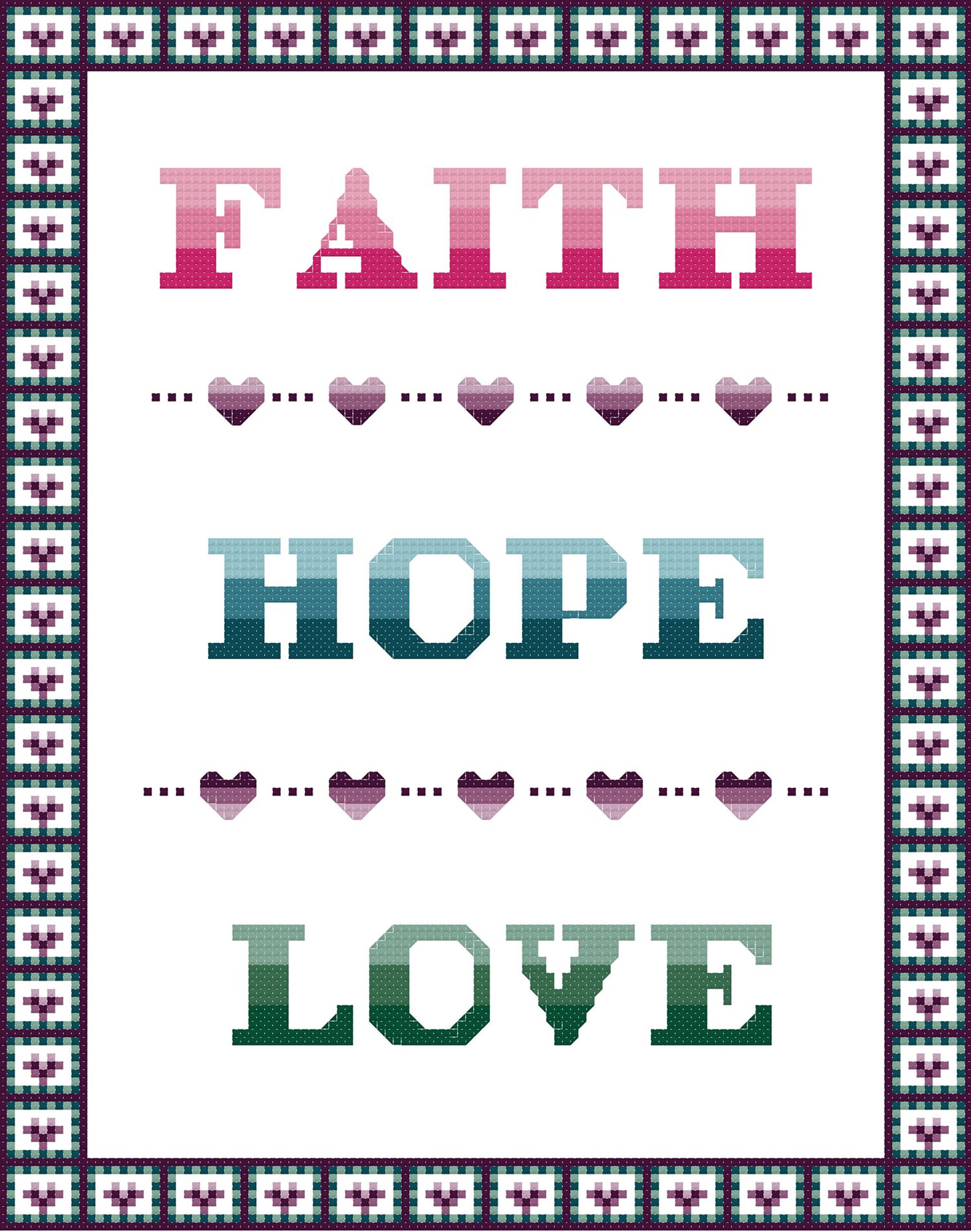 This is a beautiful sampler with the words: Faith Hope Love in a light to dark color combination. The border gives the piece a stained glass affect and ties it all together nicely. The pattern is in full color and uses full and 3/4 stitches only. This is a very cute pattern for a decorative pillow to give as a gift. The pattern maybe downloaded after payment, so you can begin right away!