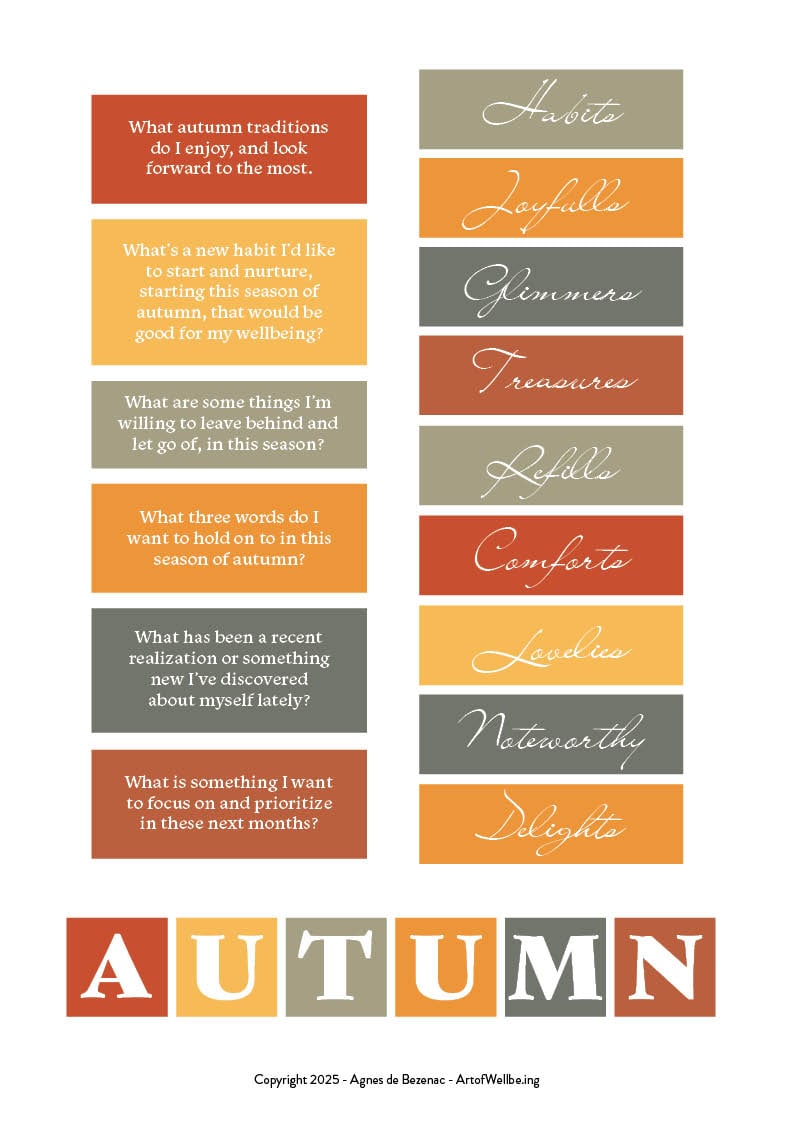 Autumn is my favorite season to lean into journaling and creative passions. What better moment for a warm drink, a cozy lamp, and a desk full of art supplies and papers? Here, I’m sharing a peek at my autumn-inspired pages and how I’ve prepared space for these prompts, in case you’d like to follow along.