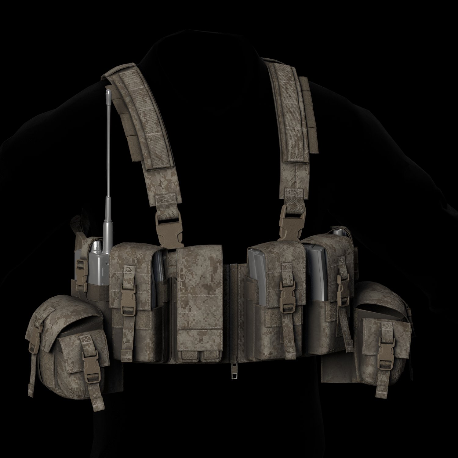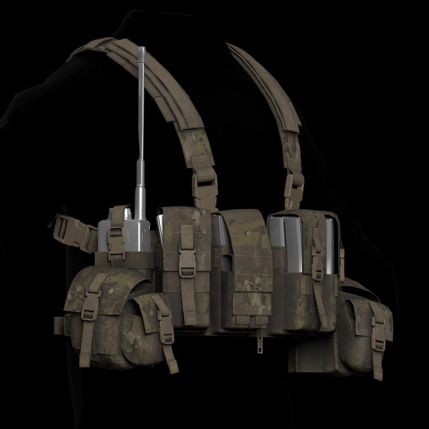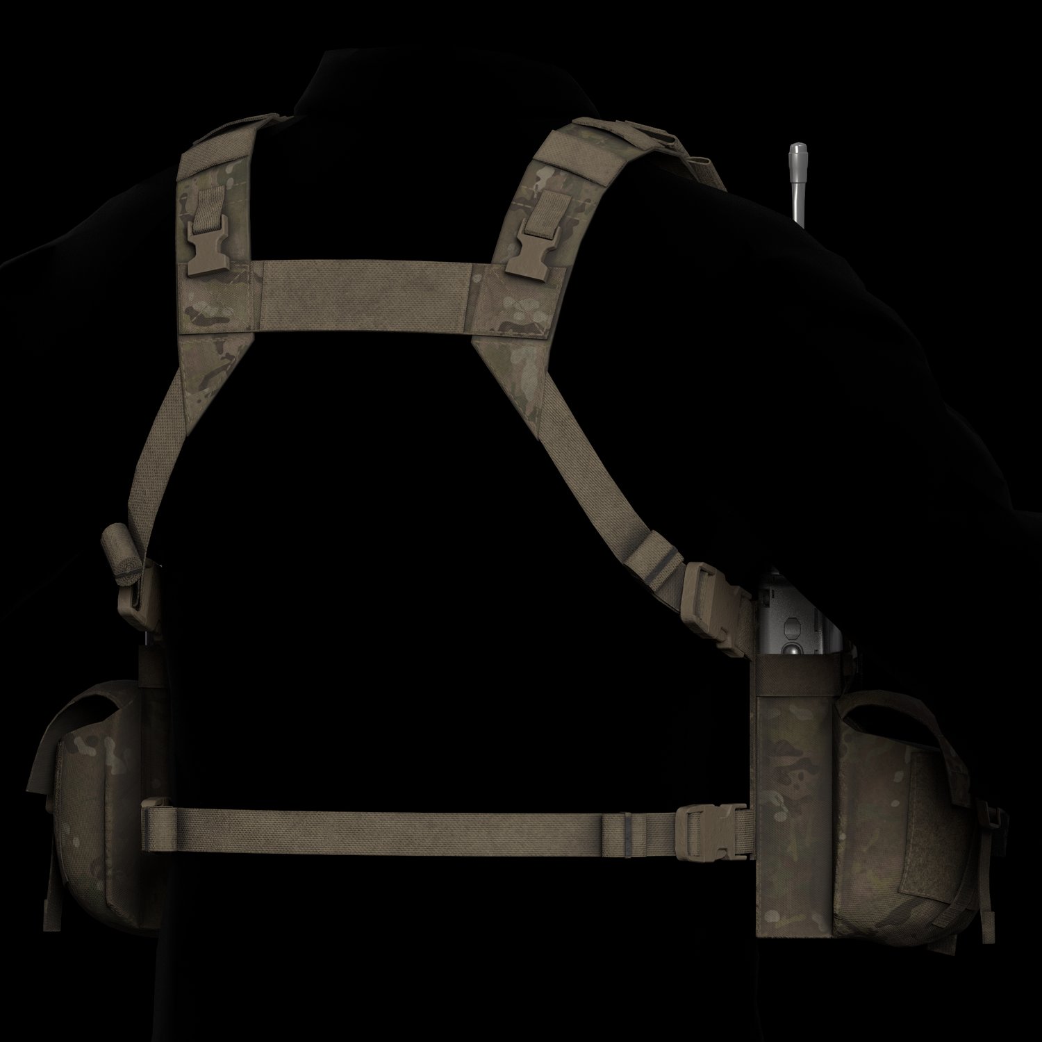 The LBT 1961A-R Zippered Chest Rig from London Bridge Trading is a durable, mission-ready load-bearing platform built in the USA. It features a front-center zipper for quick access, four double 5.56 magazine pouches, two radio pouches, and two NVG/battery pouches with external utility pockets. The rig also includes rear map pockets with hook-and-loop closures, a concealed holster compartment, and padded adjustable shoulder straps with antenna and hydration-tube guides. Designed for stability and comfort, it uses a 1-inch adjustable waist strap with side-release buckles, making it a versatile choice for professional field operations.