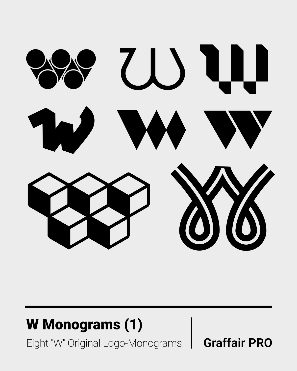 W Monograms (1): The 1st set of eight original "W" logo-monograms, included in the "1050 SVG Monograms" super bundle, amongst others, which also features an Index catalog.