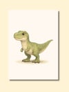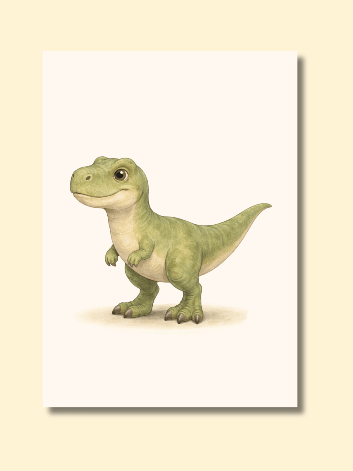 Nursery-friendly baby dinosaurs in soft watercolor — big eyes, rounded features, closed mouths. Scientifically recognizable but gentle enough for the sweetest nursery. No scary teeth, just pure prehistoric charm.