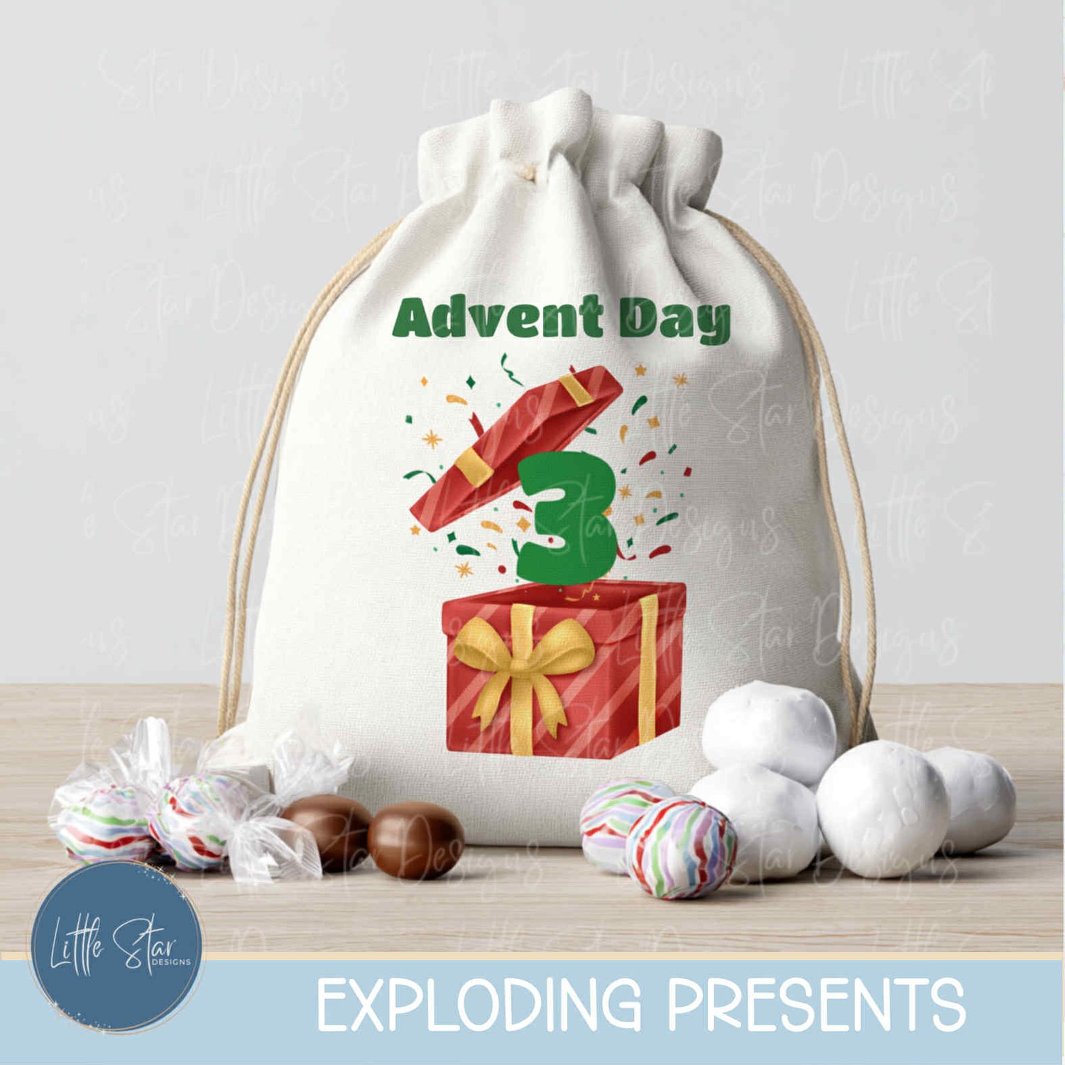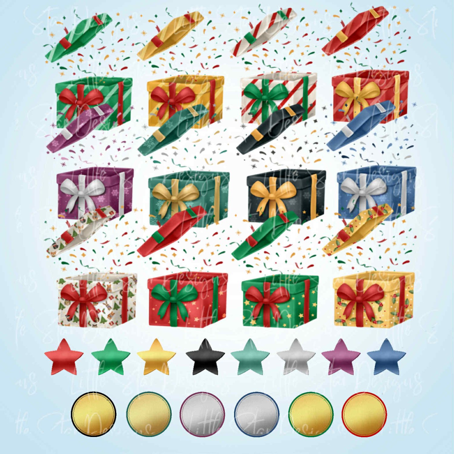This is a high-quality hand drawn (300dpi PNG) clipart set digital download of my original artwork, titled “Exploding Presents”, designed for sublimation and print.