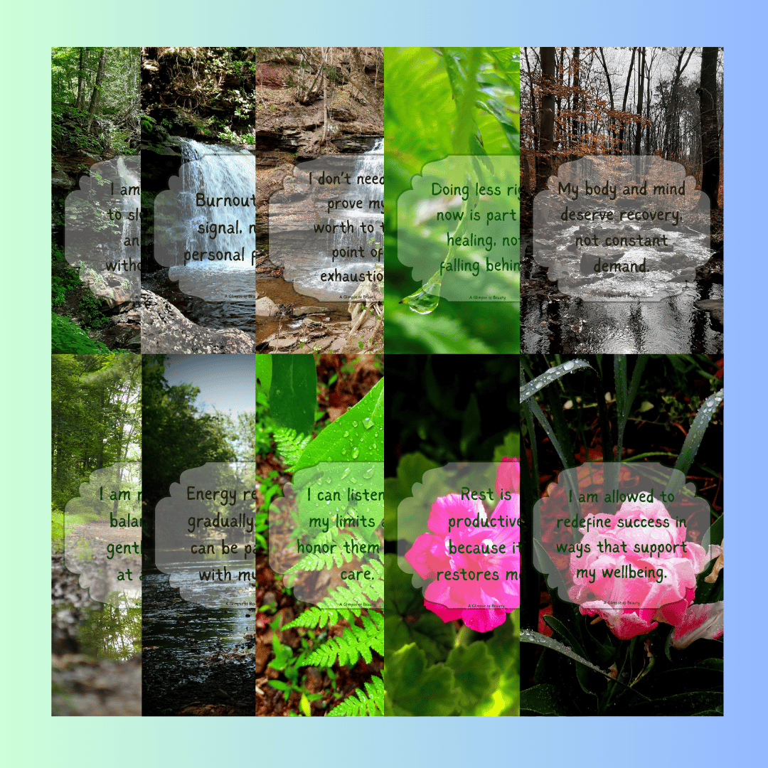 Personal growth often happens gradually, through moments of reflection and self-compassion. This affirmation set pairs 10 supportive affirmations for recovering from burnout with peaceful water-inspired nature photography. The imagery of water symbolizes renewal, emotional flow, and calm, creating a soothing visual companion for your personal healing journey. Each wallpaper offers a gentle reminder that growth can unfold naturally and that you deserve patience and compassion along the way.