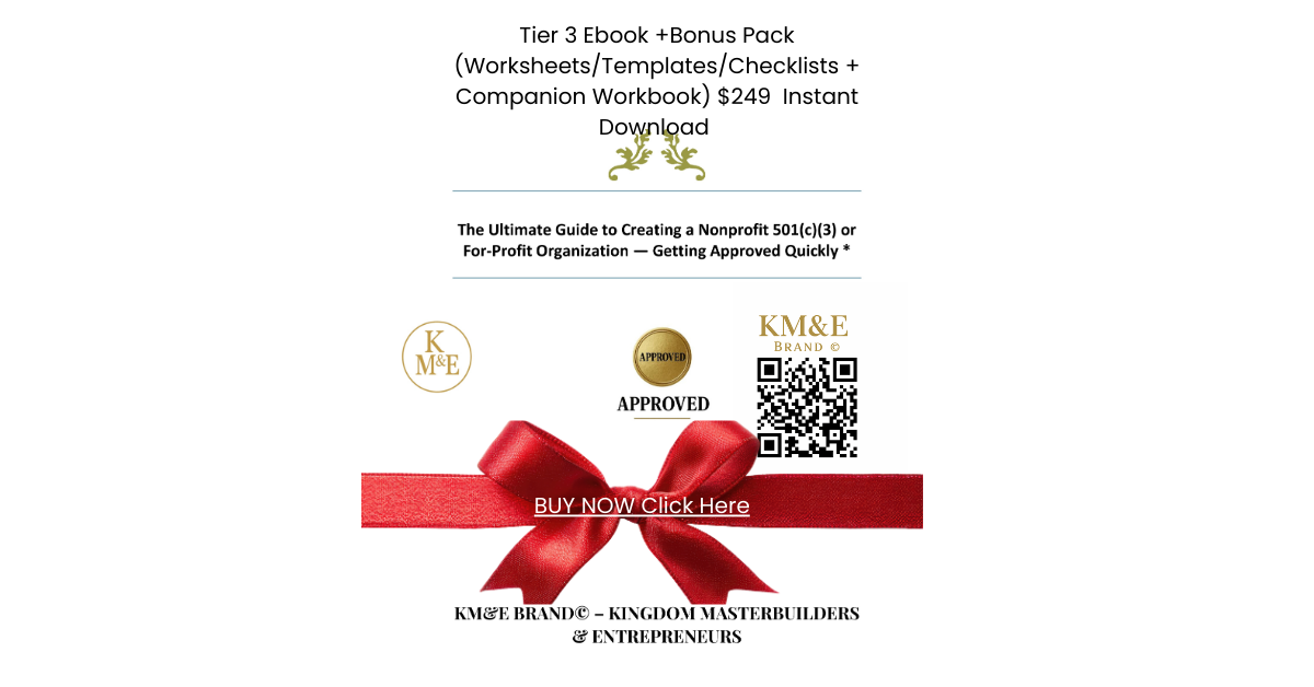 Tier 1 — Ebook Only $49 You will receive: The Ultimate Guide to Creating a Nonprofit 501(c)(3) or For-Profit Organization — Getting Approved Quickly *