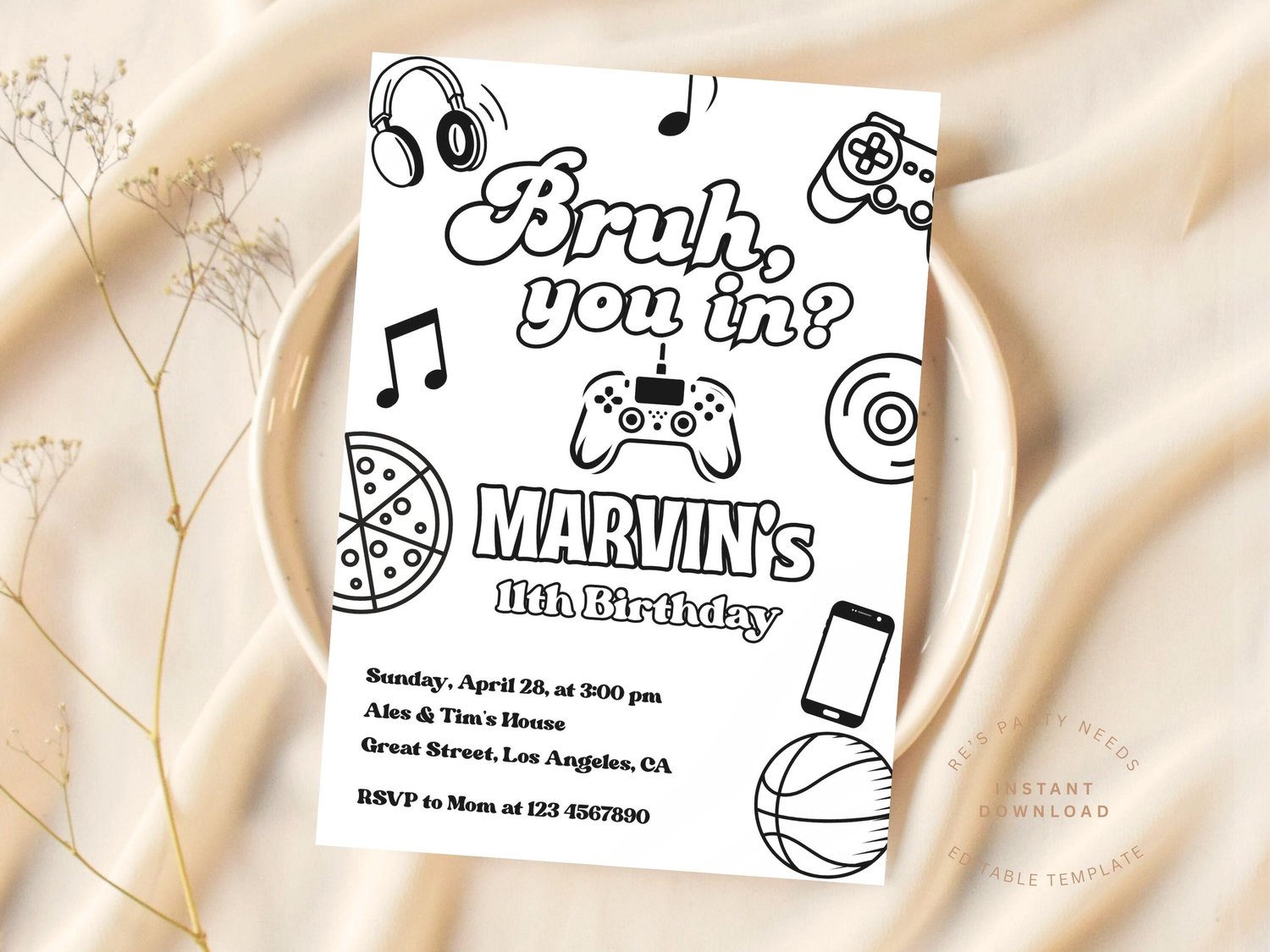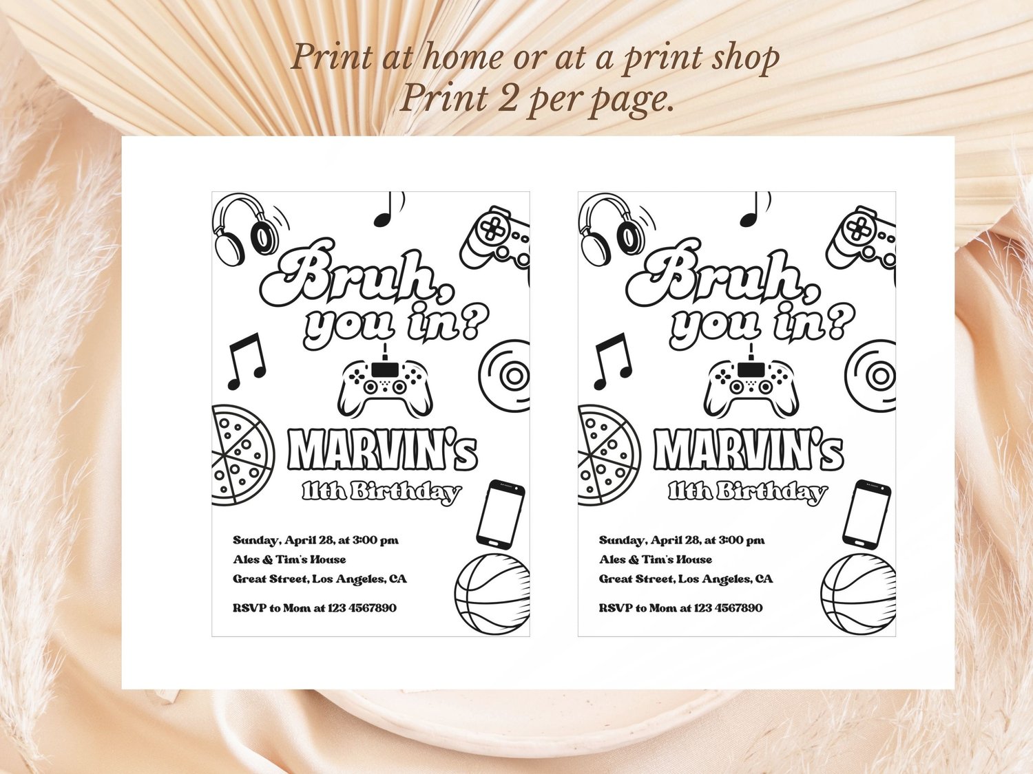 Minimalist Bruh You In? Teen Birthday Party Invitation – Gaming, Basketball, Pizza, and Music-Themed Editable Canva Template for Boys Minimalist
