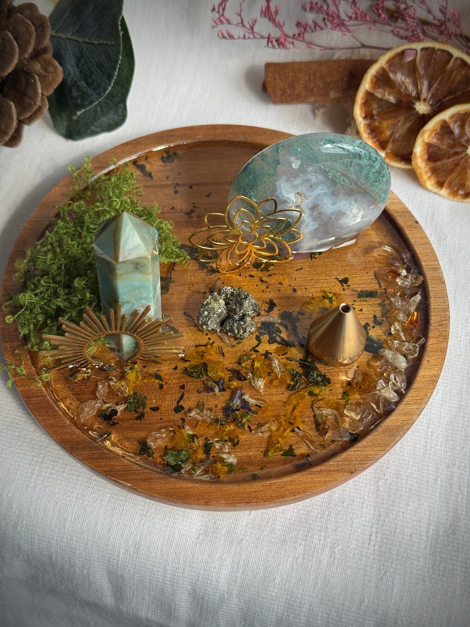 Oltář je postaven na přírodním dřevěném tácku, který symbolizuje stabilitu a uzemnění. Na jeho vrcholu se nachází citrín a pyrit – krystaly známé svou schopností přitahovat hojnost, chránit energii a posilovat sebedůvěru a finanční tok.