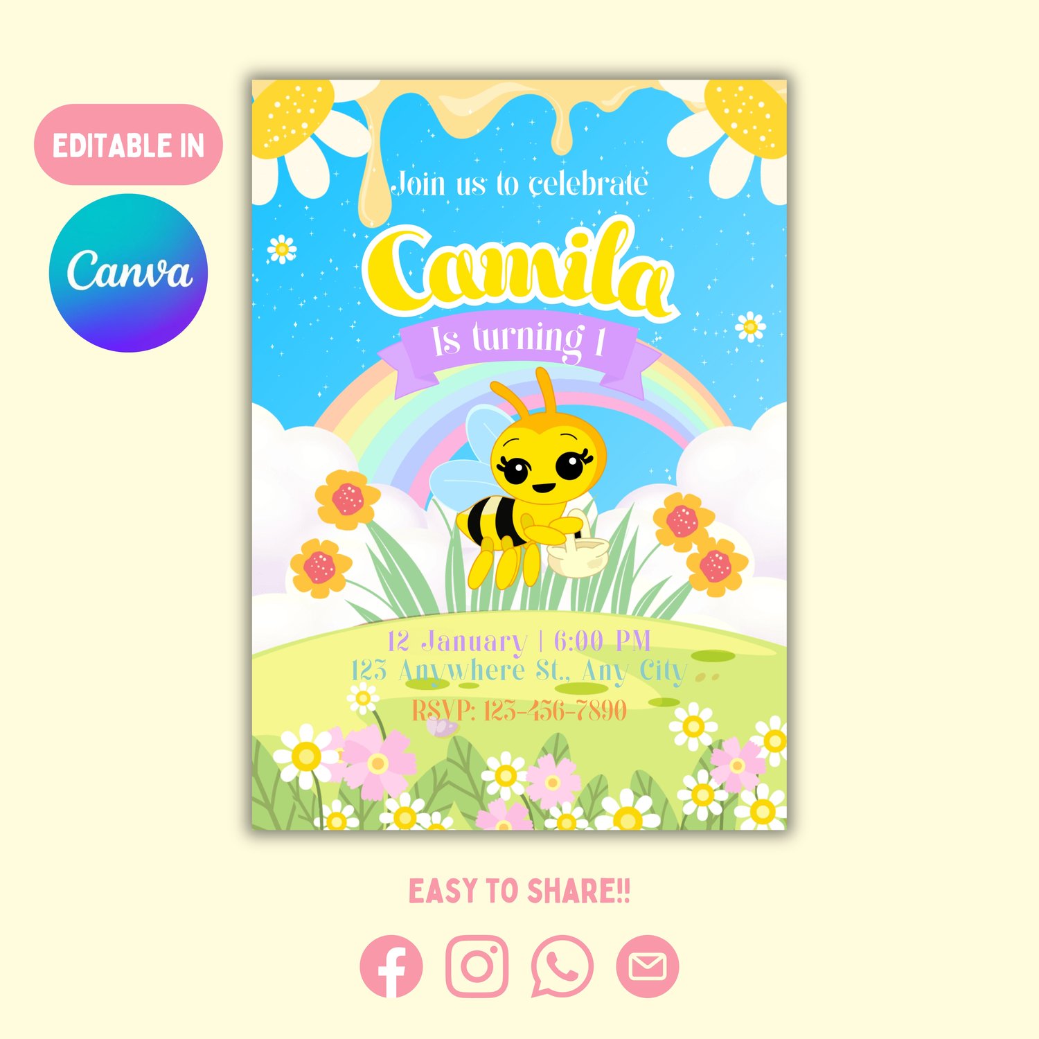 Invitación de Cumpleaños Editable Abejita Chiquitita Turqueza (Canva)