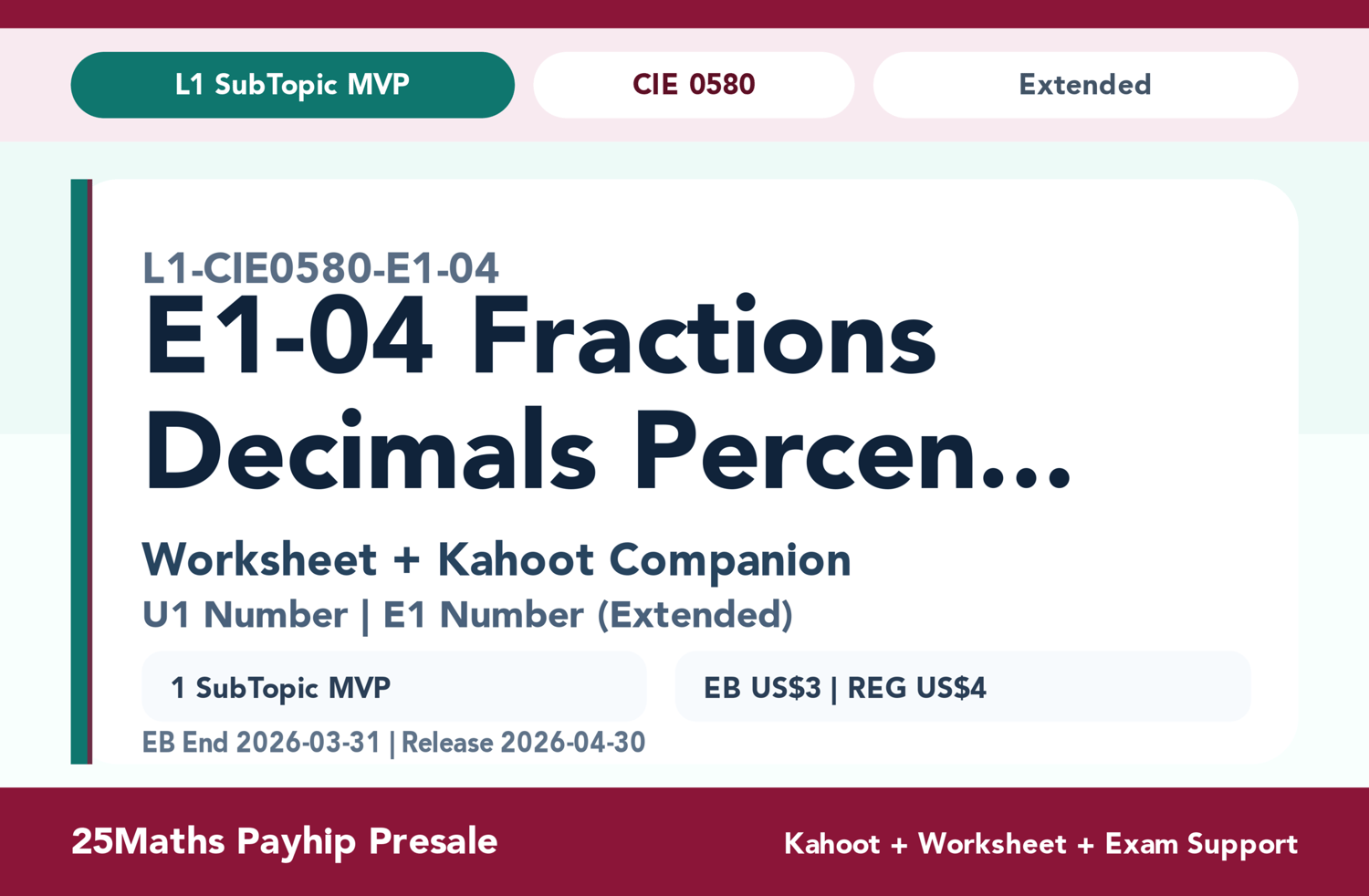 Master Fractions, Decimals, and Percentages for your CIE 0580 Extended Exam with our Interactive Practice Suite! Whether you're a student securing your advanced marks or a teacher looking for engaging classroom resources, this worksheet and Kahoot combo is built directly from the official CIE syllabus.