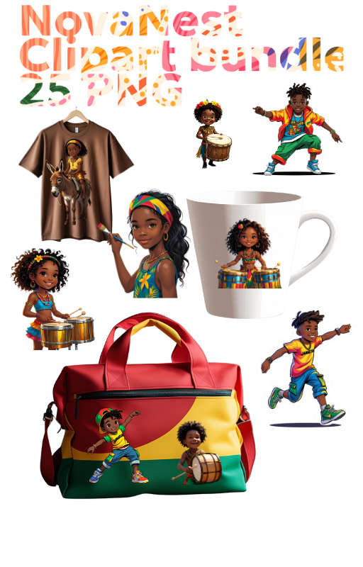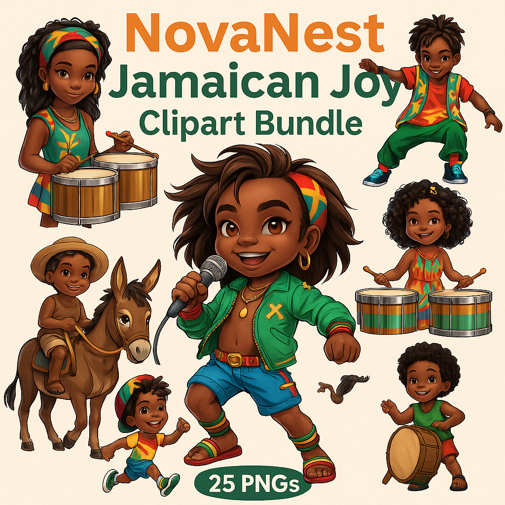 Bring the vibrant spirit of Jamaica to your creative projects with the NovaNest Jamaican Joy Clipart Bundle! This colorful collection features 25 high-quality PNG images of adorable Jamaican children dancing, playing drums, painting, and celebrating island life.