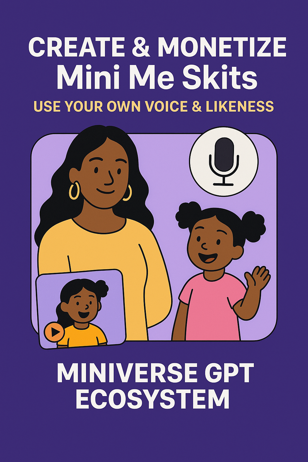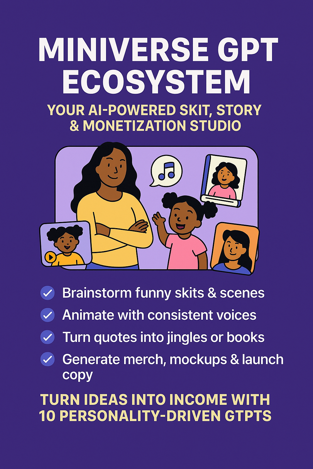 The MiniVerse GPT Ecosystem isnβt just a tool β itβs your full-blown AI-powered creative empire. Designed for creators, storytellers, and digital entrepreneurs, this all-in-one GPT suite lets you go from a simple skit idea to a fully animated show, voiceover, song, storybook, and merch line β all powered by smart, personality-driven GPTs that work together like a dream team.