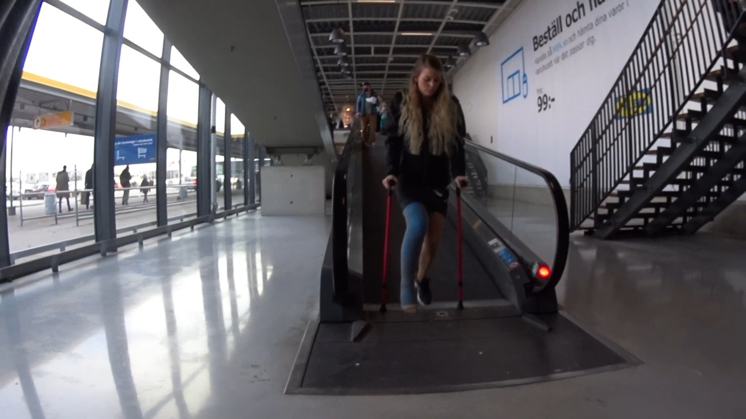 Ice is crutching to the exit at IKEA but first she must check if there is any nice flowers she can buy.