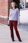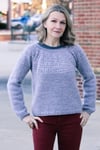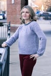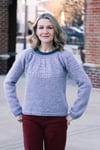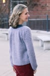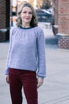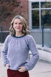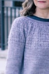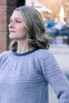Construction: Akvavit is worked seamlessly from the top down using round yoke construction, with a simple texture on the yoke and a plain stockinette body and unadorned neck. The hem and cuffs are worked in K2P2 rib on smaller needles to create a slight blouson shape to the body and sleeves. Stitches are cast on in the round at the neckline, the back neck is shaped with a few short rows, then the yoke is worked to the bottom of the armhole. Sleeve stitches are placed on hold while the lower body is worked without shaping to the hem. Full length roomy sleeves are then continued to the cuffs; alternate instructions are given for traditional tapered fit sleeves.