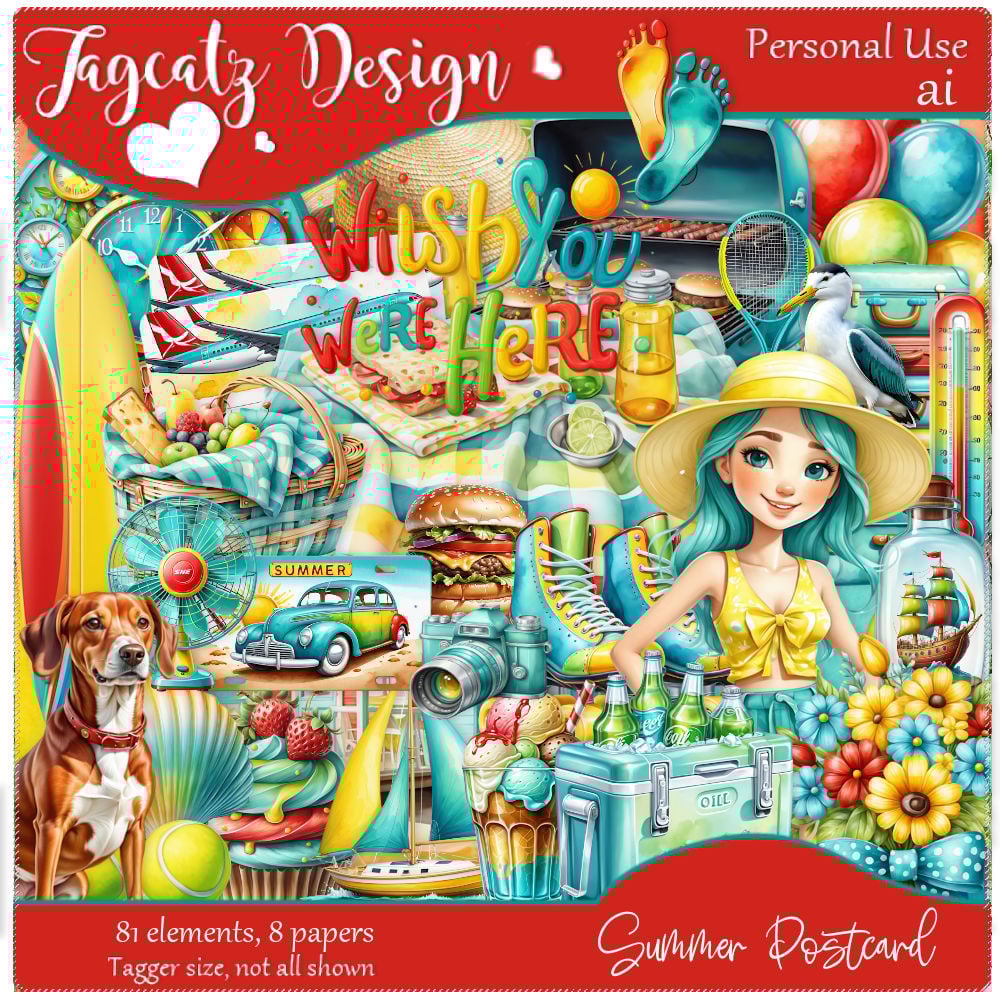 Everything summer vacation with food, travel, sports and more. 81 elements and 8 matching papers. AI product. Tagger size. Personal use only. Not all shown.