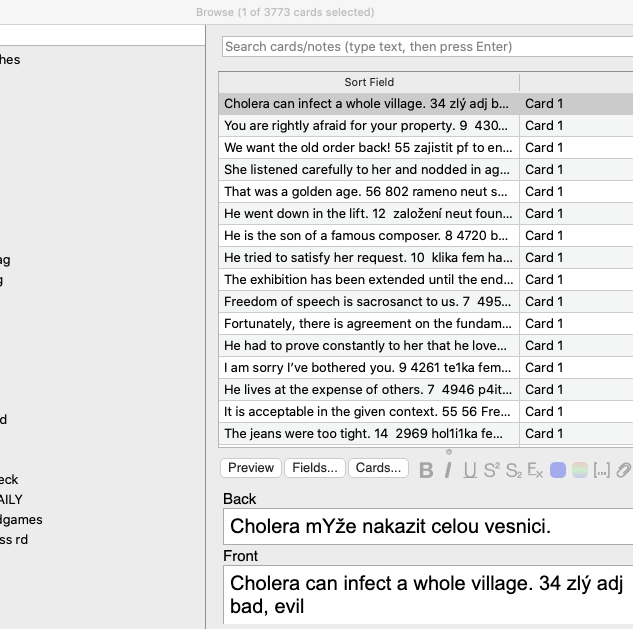 Do you like the novels of Franz Kafka? Are you inspired by the Romanesque architecture of Prague? Why not learn Czech? 3773 cards of the example sentences and translations from the frequency dictionary of Czech. For some reason only 3773 cards would upload to my anki program. I offer this deck half price for this reason.