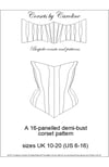 This is a 16-panel demi-bust corset pattern with a beautiful curve to accentuate your waist. Sizes (UK) 8 -24 (US 4 - 20). Attributes - low top-line finishing just above the nipple so this design is designed for either the boudoir or to be worn over clothing. The cup options are 3''(standard A-C) and +4'' (approx. D) or +5'' above the under-bust - approx DD. INCLUDES A 25 PAGE DOCUMENT OF CORSET CONSTRUCTION NOTES!