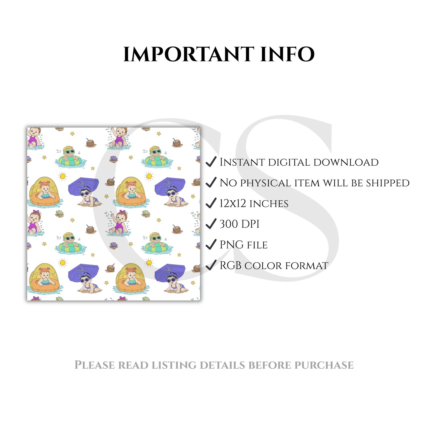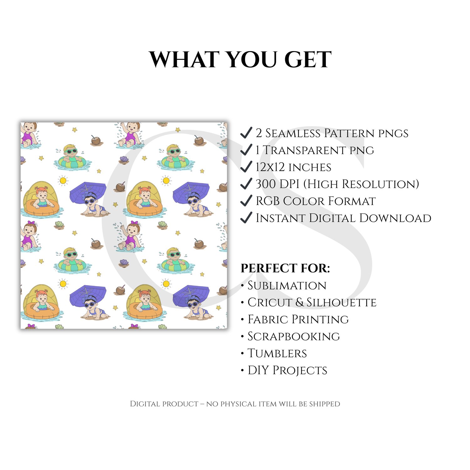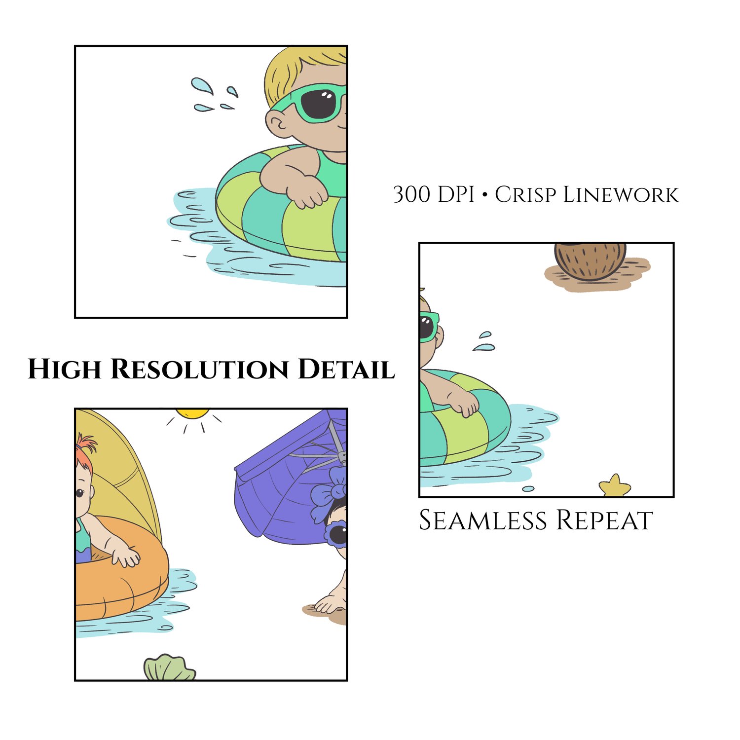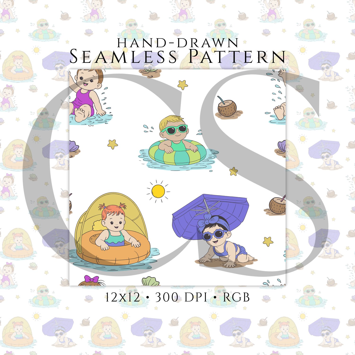 Hand-Drawn Summer Baby Seamless Pattern PNG, Beach Baby Digital Paper, Pool Float Kids Pattern, Cute Summer Fabric Design, 12x12 Repeat