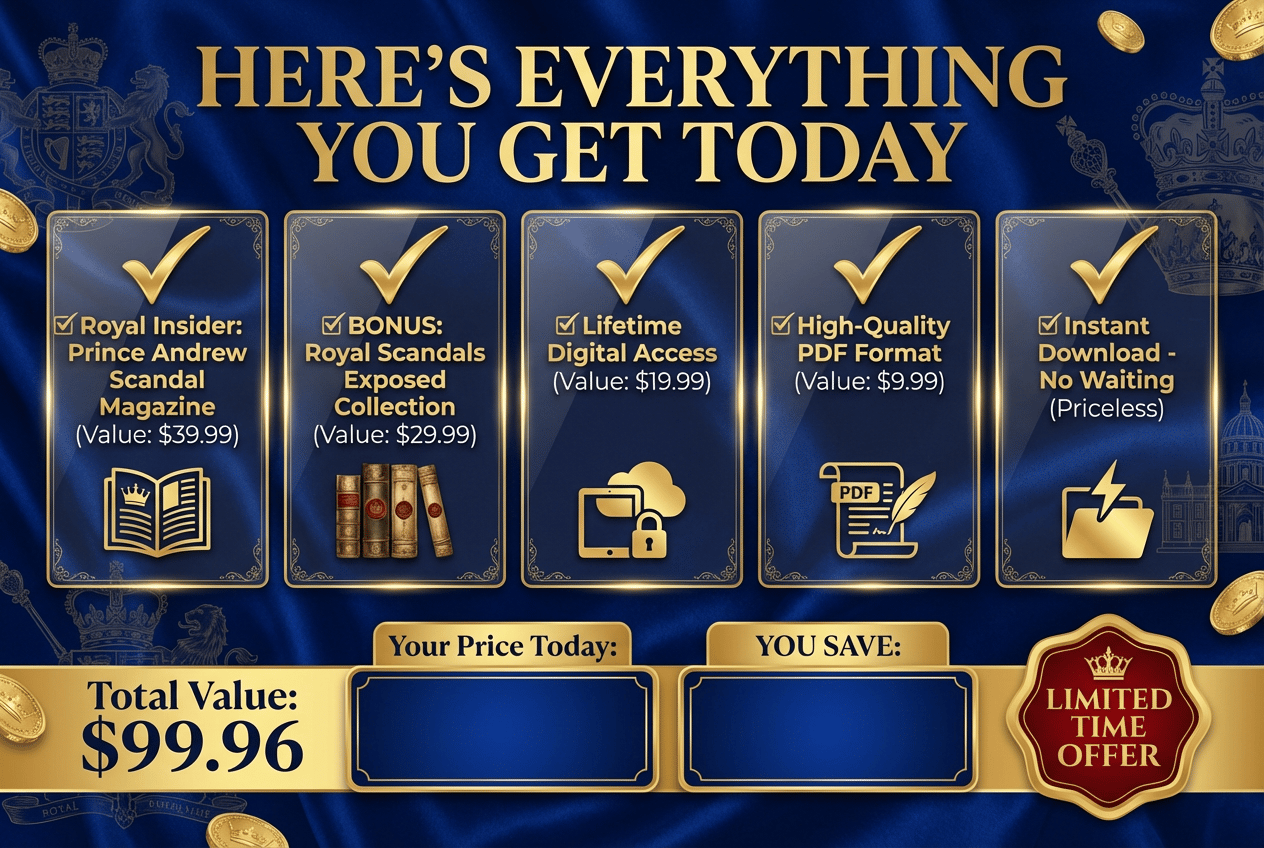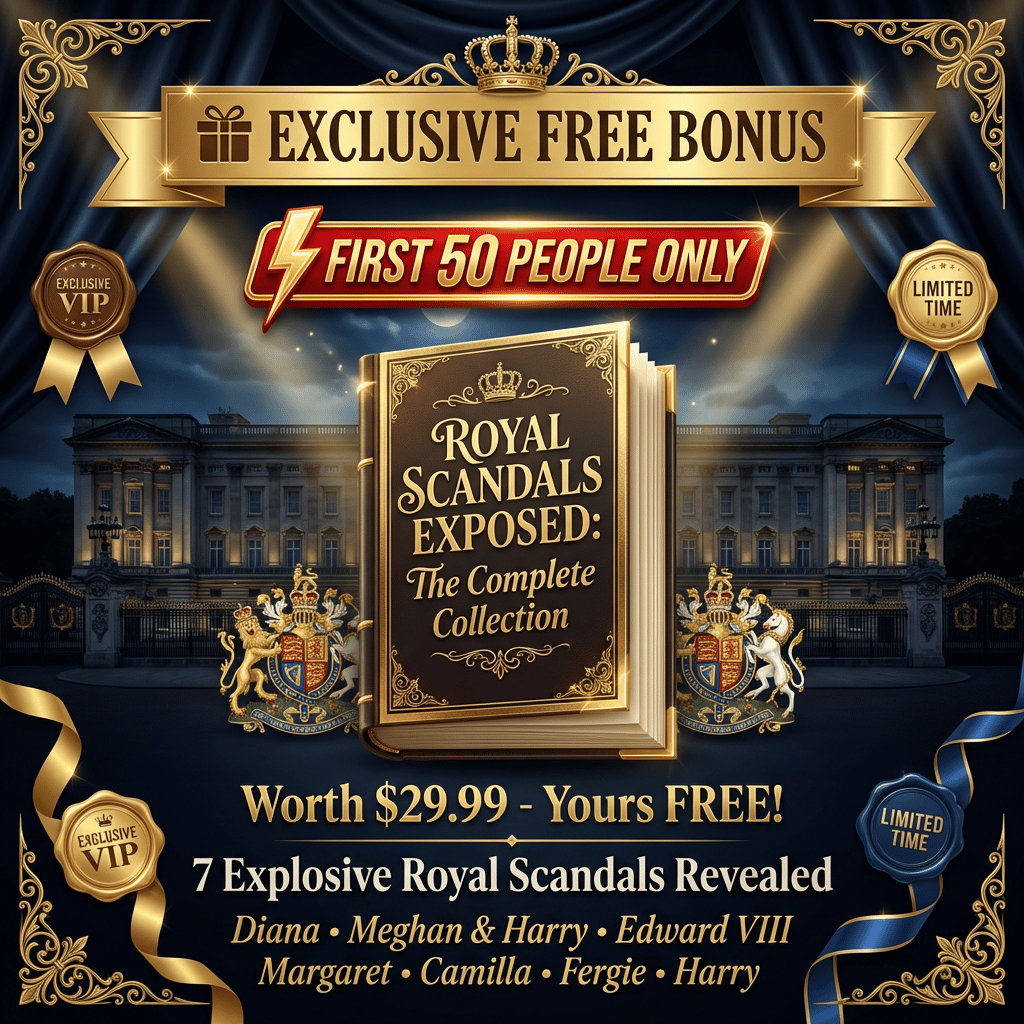 When you purchase today, you'll also receive "ROYAL SCANDALS EXPOSED: The Complete Collection" (Worth $29.99) absolutely FREE! This premium bonus covers 7 other explosive royal scandals including Diana, Meghan & Harry, and more. But hurry - this bonus is only available to the first 50 customers!