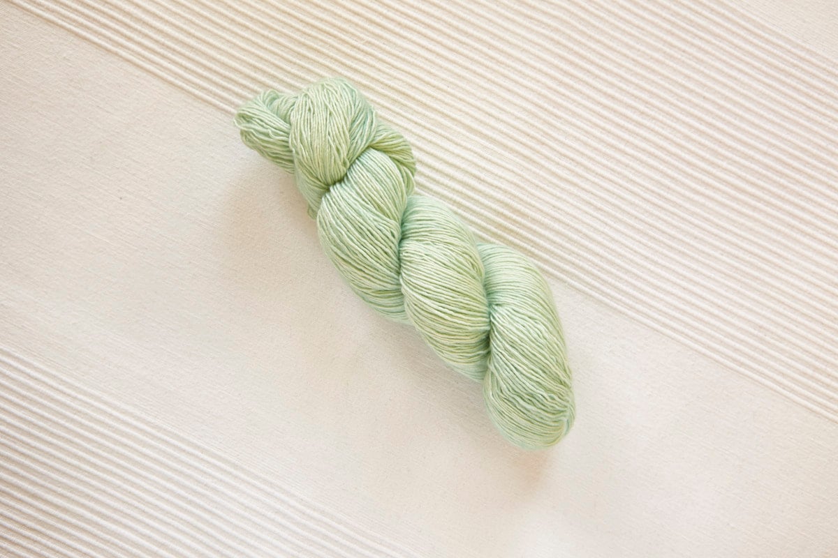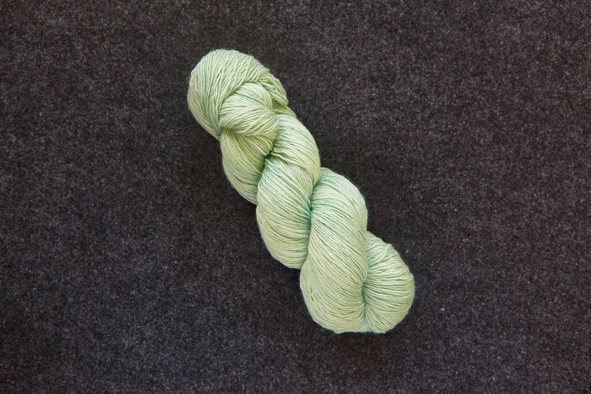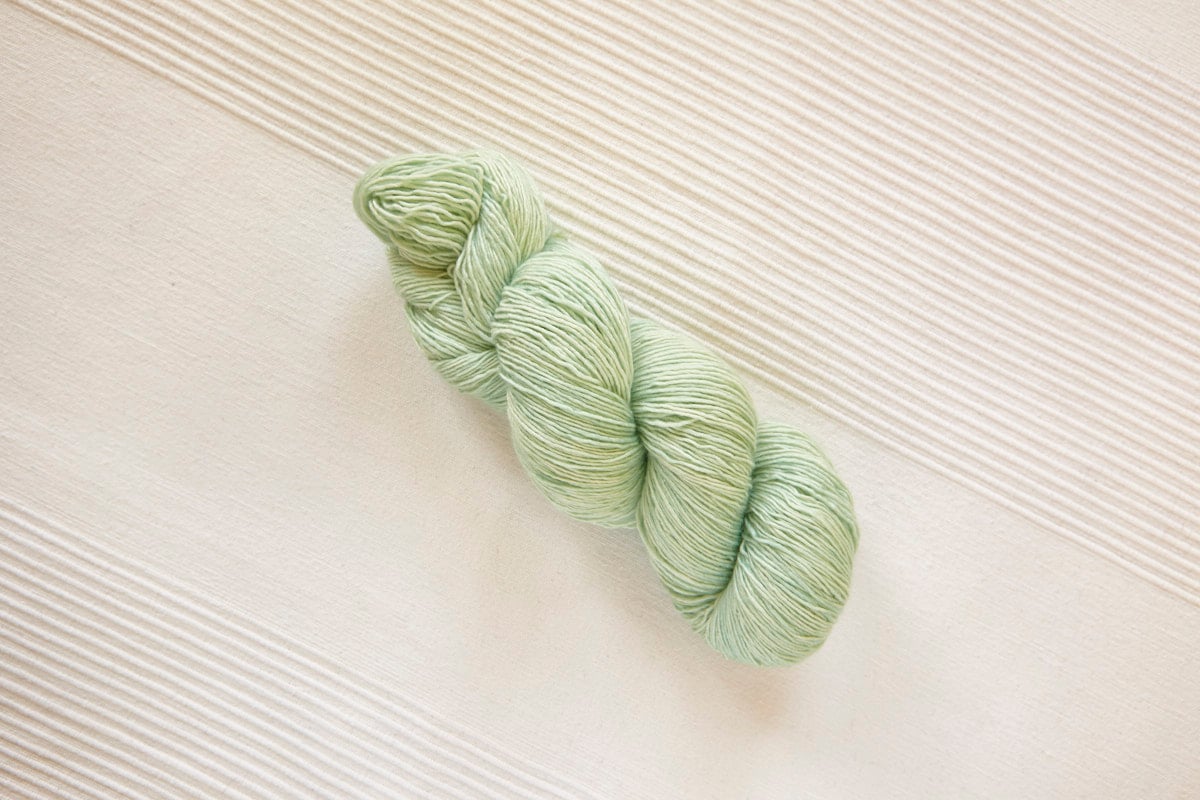 Silky Way (Fingering) in colorway: Misty Meadow. Semi-solid. Light meadow green with slight teal undertone and glazed effect
