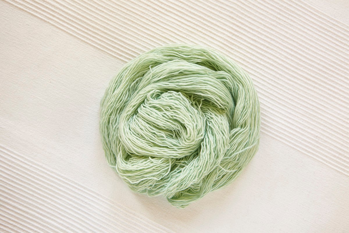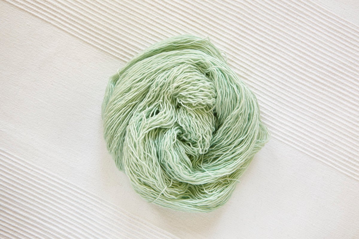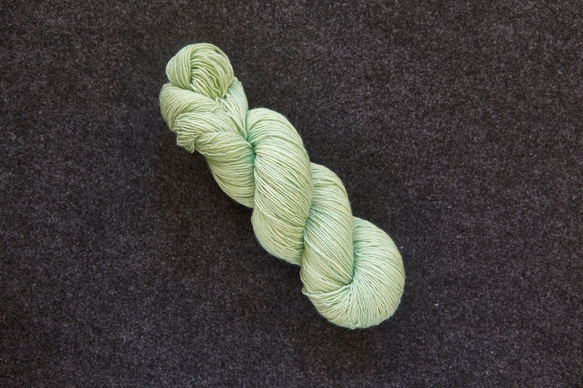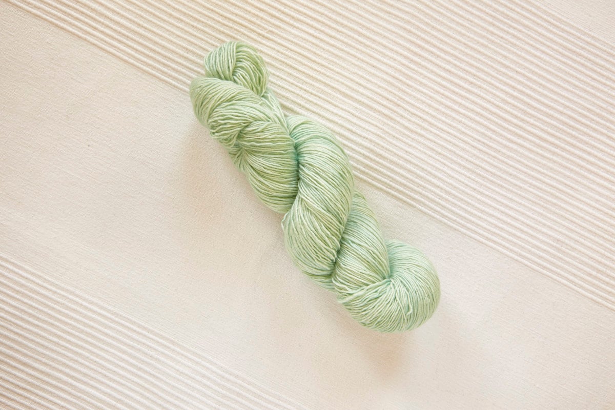 Silky Way (Fingering) in colorway: Misty Meadow. Semi-solid. Light meadow green with slight teal undertone and glazed effect