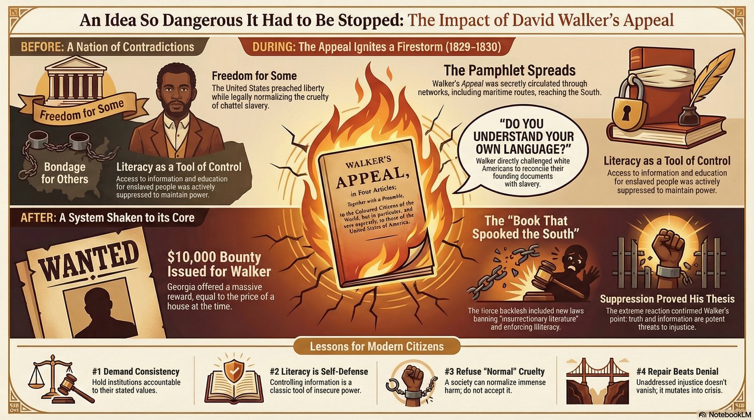 David Walker’s Appeal, a radical 19th-century abolitionist pamphlet, serves as the foundational subject for this research project. The document famously utilized founding American ideals and religious ethics to expose the hypocrisy of slavery while calling for Black resistance and global unity. These sources detail a comprehensive plan to translate Walker’s historical arguments into modern civic standards, focusing on truth-telling, literacy, and the refusal to normalize social harm. Additionally, the materials bridge political theory with spiritual wisdom, connecting Walker’s message to Ifá tradition and Hip Hop culture through the lens of joy and communal unity as tools for liberation. The project ultimately provides a structured toolkit for educators and creators to apply these lessons to contemporary issues like information control and institutional accountability. This synthesis illustrates how historical activism can become a modern blueprint for dismantling oppressive structures through collective action and the reclaiming of human dignity.