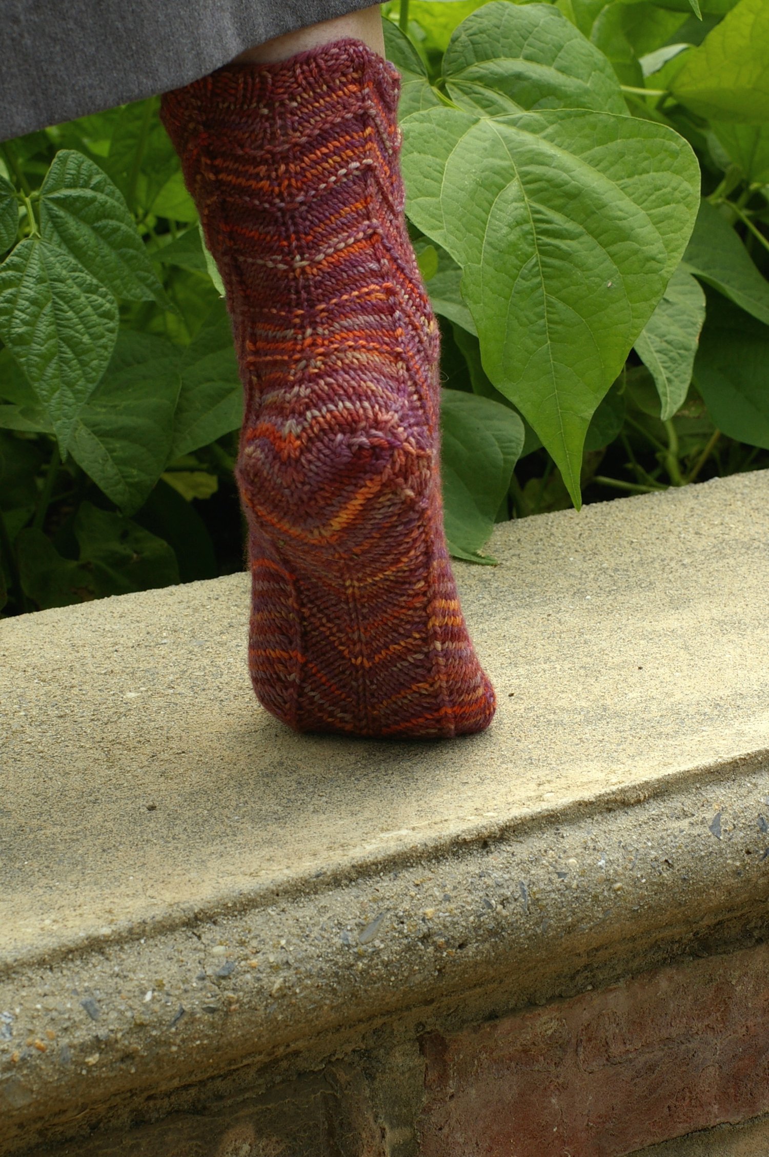 These socks are worked from the top down in a chevron stitch adapted to each size. A gusset is worked into the pattern before and after the short row heel. Patterning continues all the way from the cuff to the toe, which means that variegated and stripy yarns really sing. This is knit in a heavier weight of yarn than normal for socks, resulting in a quick knit that's oh so comfy on the feet.