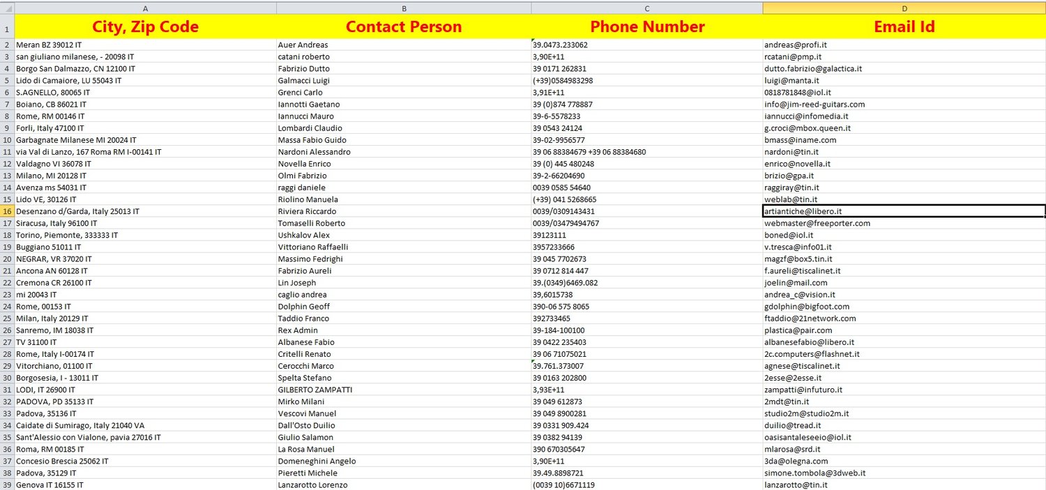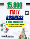 You will receive 15,800 Italian Business e-mails with the information of City, Zip Code, Contact Person, Phone Number. These emails are ideal for marketing purposes, whether you use platforms like Mailchimp or Omnisend, or send emails directly from your own address.