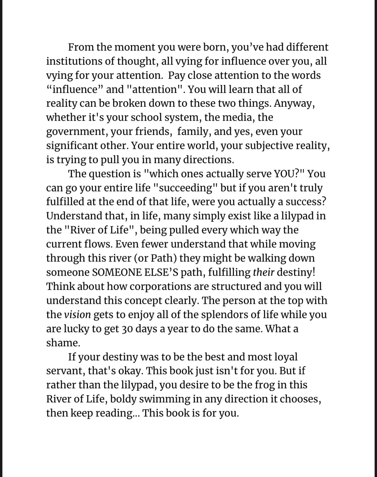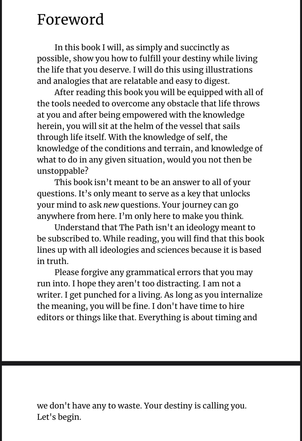 The Path is a book that teaches how to take the first steps of the rest of your life. It does this using ration, reason, illustrations, and analogies. At 33 pages in length, this short read isn't meant to radically change your life in one read. However, if you can understand and internalize the principles behind "The Path", it will radically change your mind, thereby changing your life.