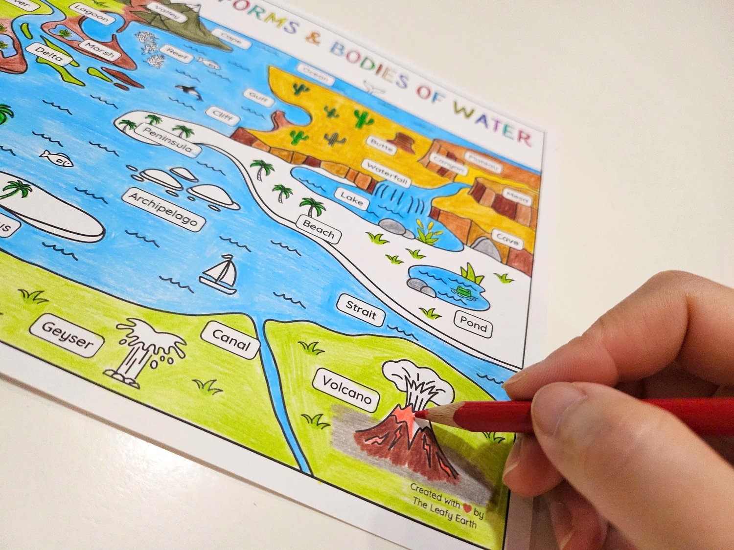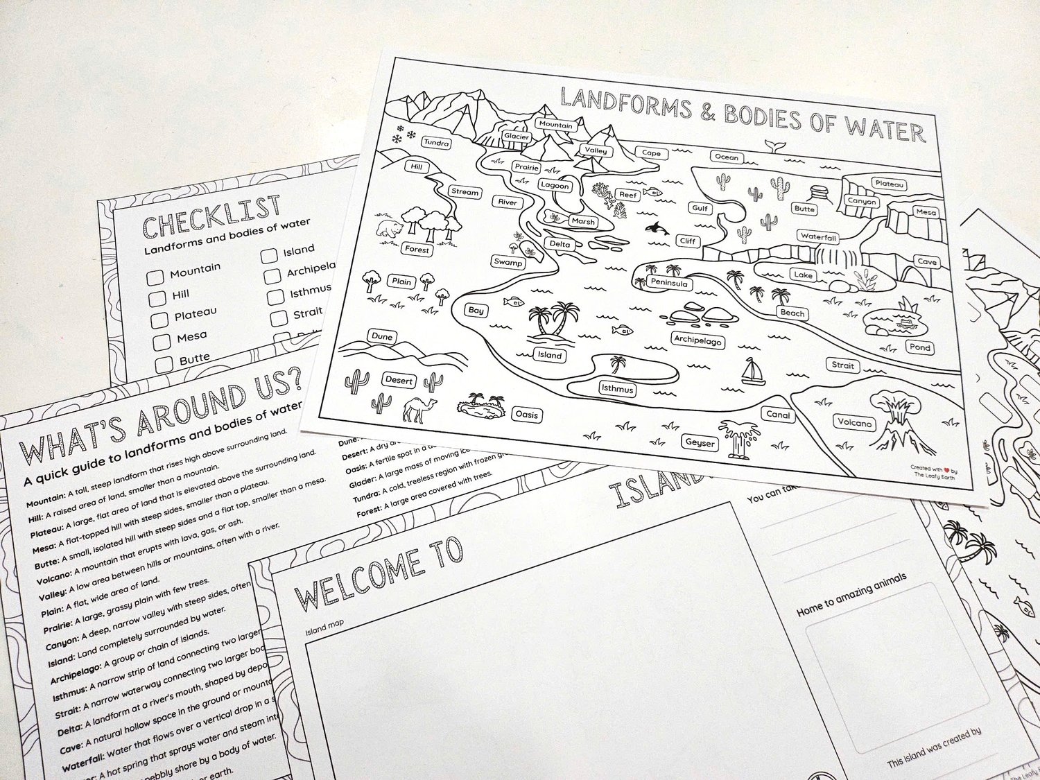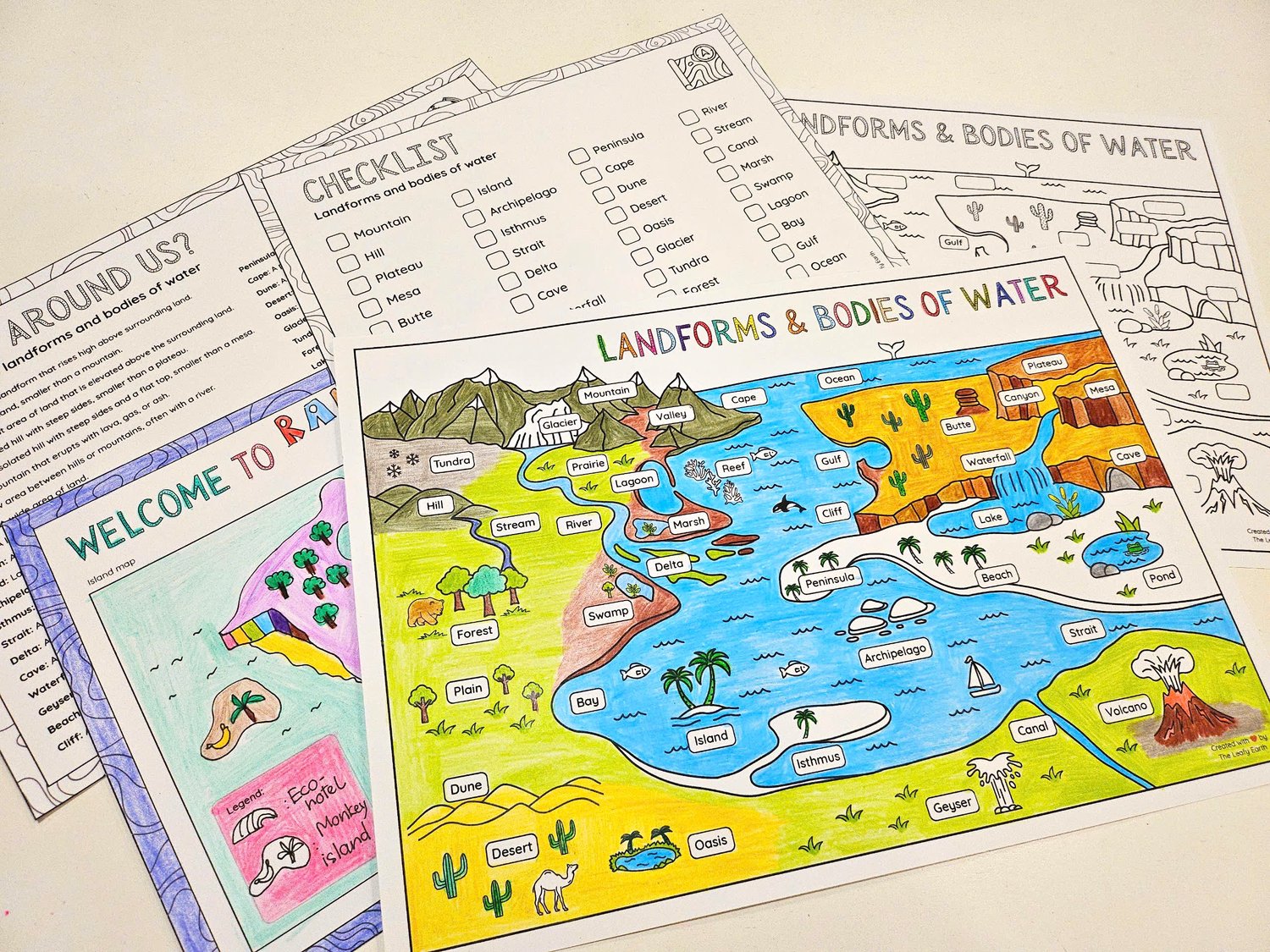 ✿ This printable is a hands-on way for kids to explore 40 different landforms and bodies of water.