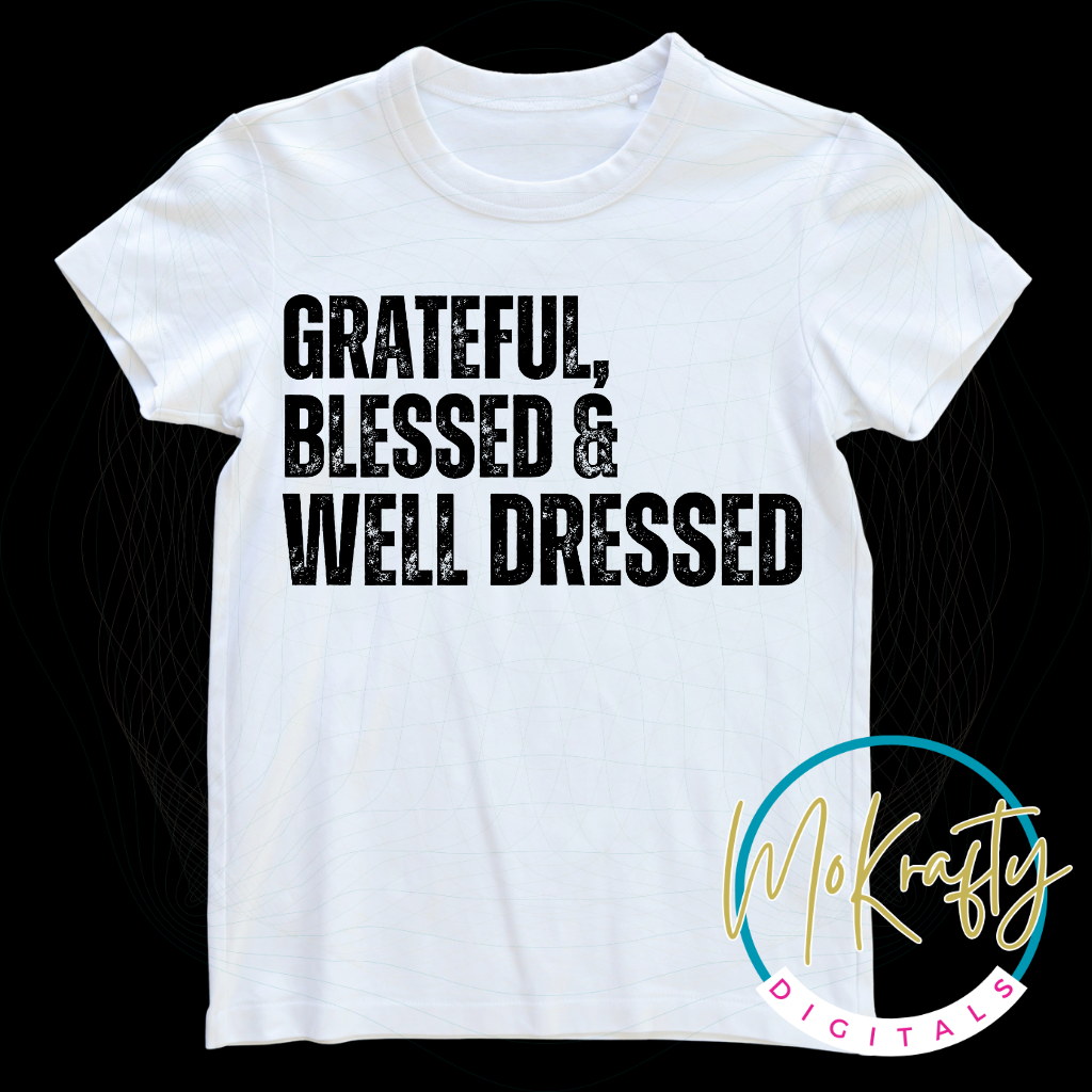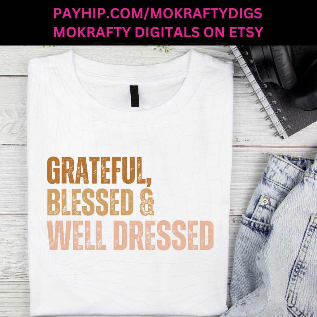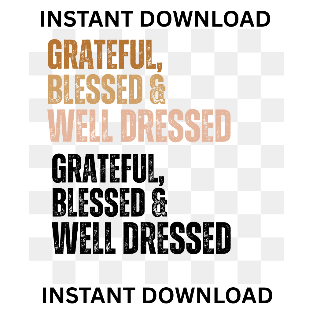 Stay stylish and spread positivity with this “Grateful, Blessed & Well Dressed” PNG design ✨ A bold, trendy digital download perfect for your crafting needs. Ideal for sublimation, DTF, or printing on apparel, drinkware, and more. Comes with 2 PNG versions so you can create with flexibility and flair.