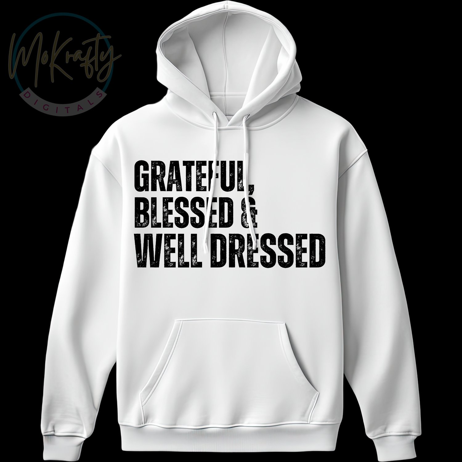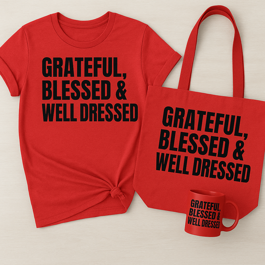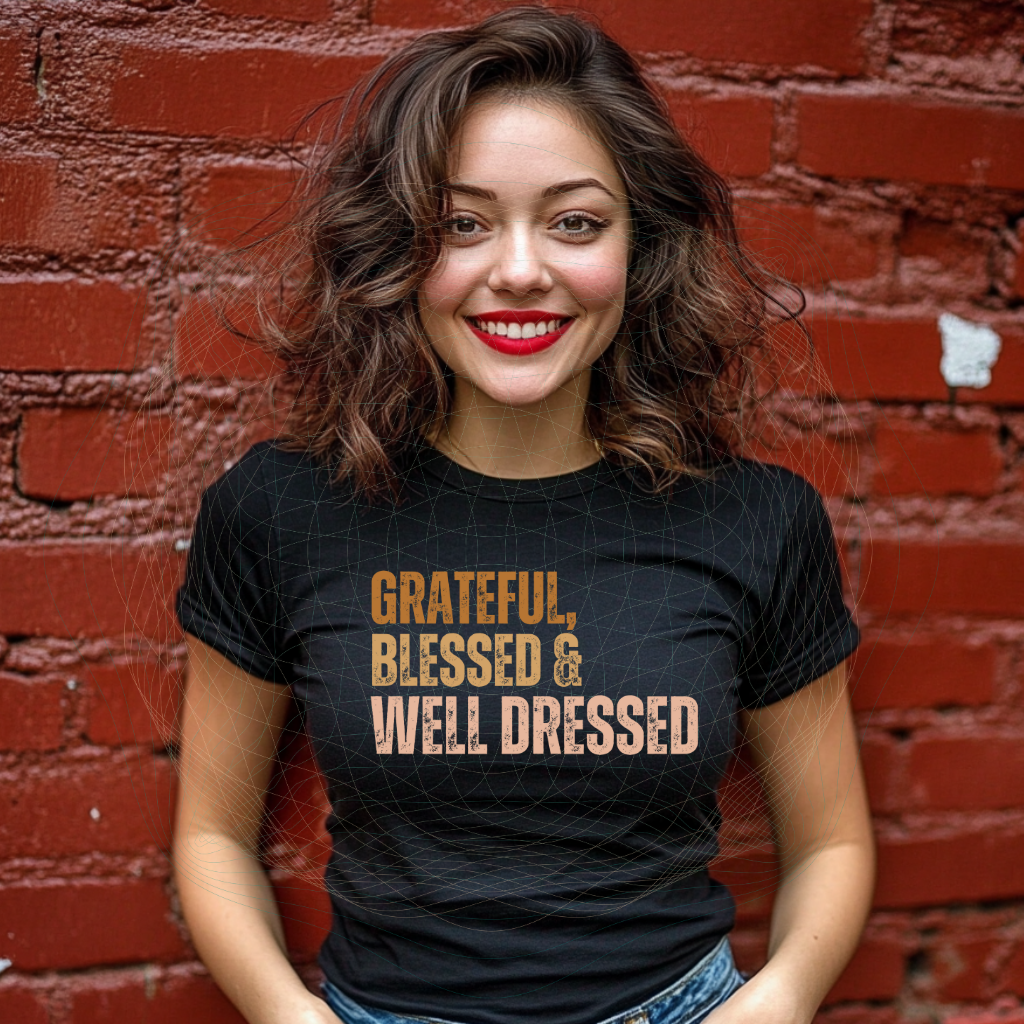 Stay stylish and spread positivity with this “Grateful, Blessed & Well Dressed” PNG design ✨ A bold, trendy digital download perfect for your crafting needs. Ideal for sublimation, DTF, or printing on apparel, drinkware, and more. Comes with 2 PNG versions so you can create with flexibility and flair.