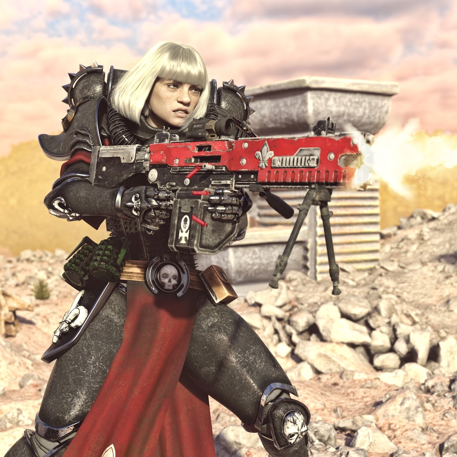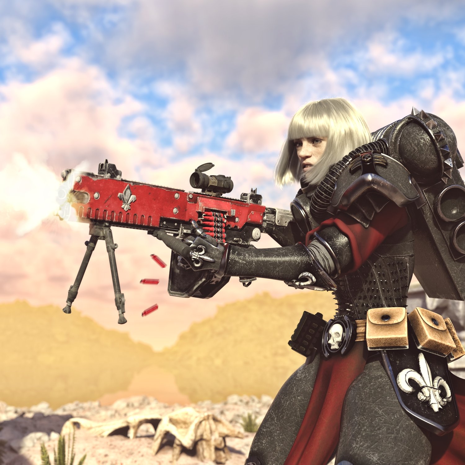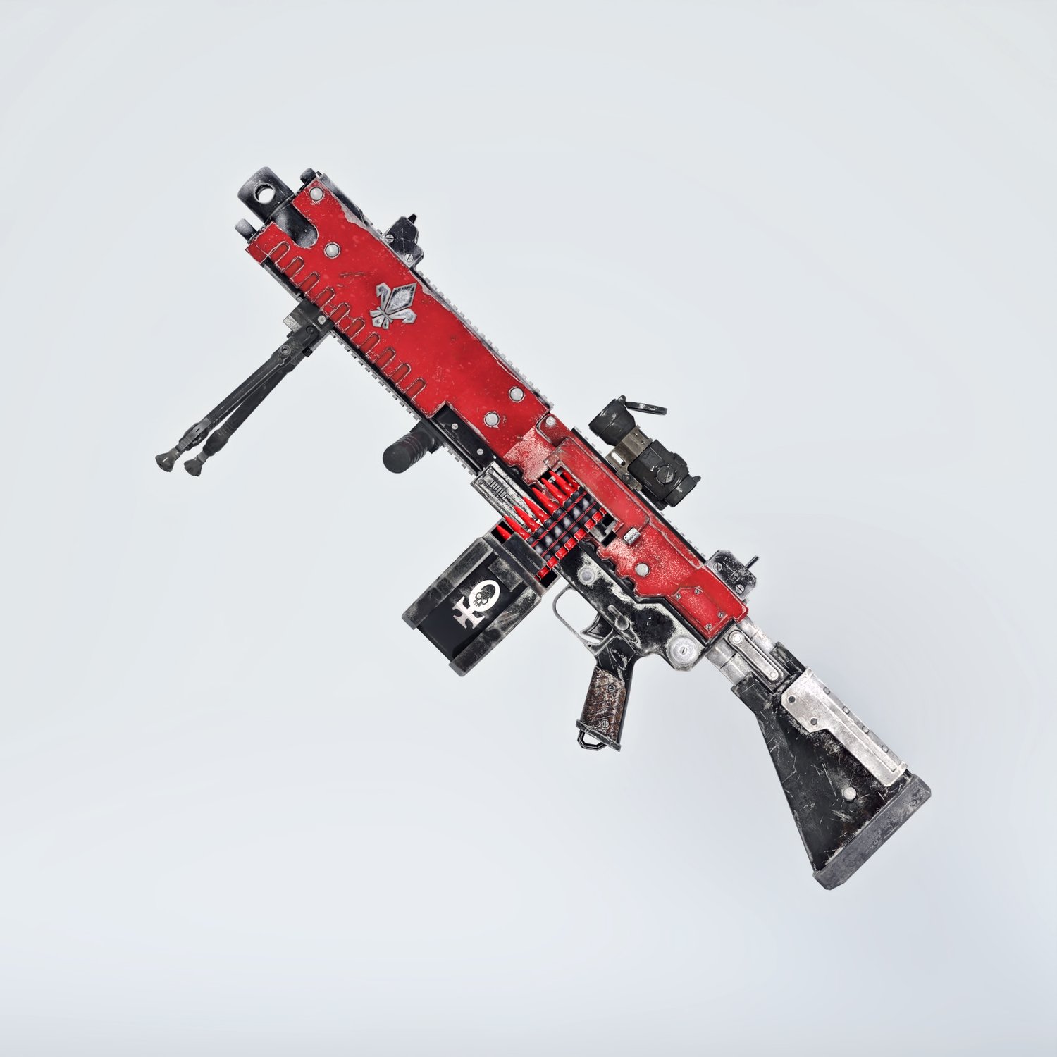 The gun is based on the Evolys machine gun, but very loosely, rigged and converted for use with DAZ. A grim dark future aesthetics, for your sisters of battle fighters. Trigger, safety, bolt, etc also rigged for more realistic pictures. Includes some attachments for various porpoises and pictures, like a red dot sight, a bipod, front grip.