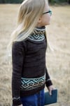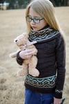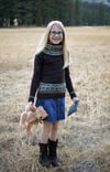 Notes: Petite Peaks and Valleys Sweater is worked from the top down with a fun colorwork section at the bottom of the body and the sleeves. The pattern includes directions for both a standard collar and a colorwork cowl collar.