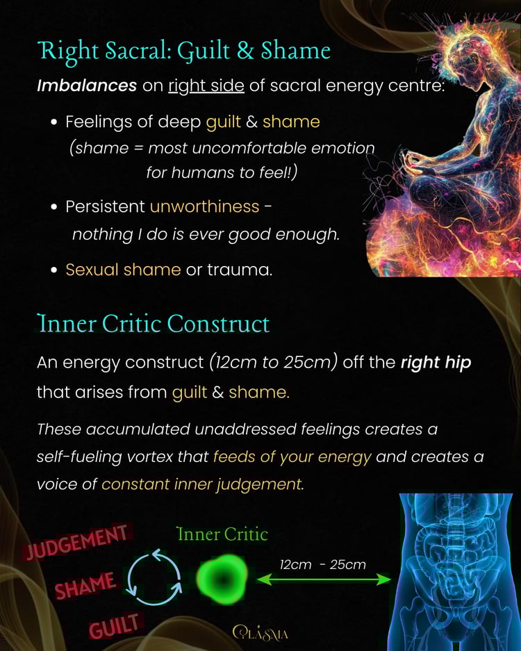 - Right side imbalance: Deep guilt and shame patterns that can turn into an “Inner critic” construct that feeds on this energy. Perfectionism where nothing feels good enough.