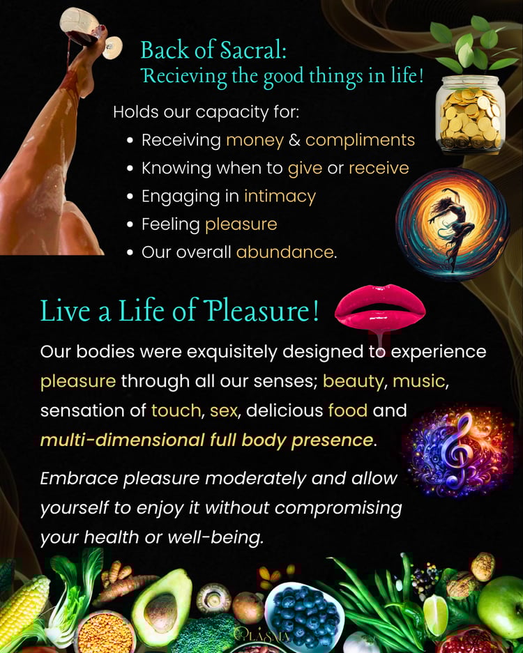 RIGHT SIDE of the sacral (guilt, shame and the voice of the inner critic), the LEFT SIDE of the sacral (frustration and disappointment) and the FRONT of your sacral (how we relate to others and express ourselves).