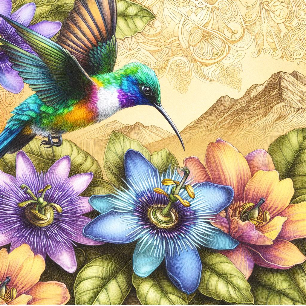 Beautiful & colourful humming birds on bright passion flowers with an embossed gold background.