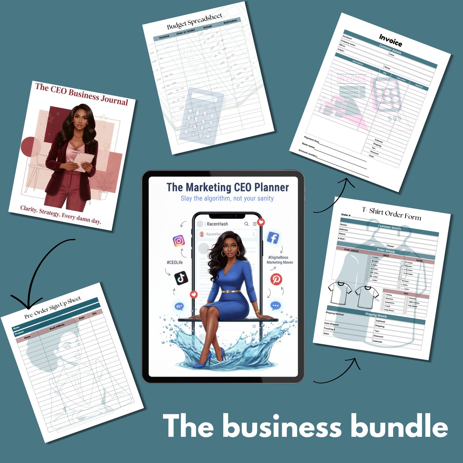 Marketing CEO Planner Bundle • Business Planner Templates • Small Business Digital Planner • Marketing Budget • Customer Tracker • Content Promotion Tracker • Printable CEO Planner • Business Journal • Invoice & Order Forms • Price List • Packaging Invent