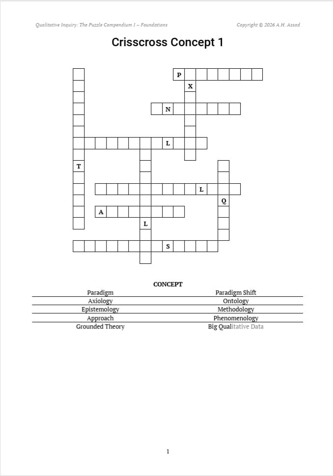 This publication encompasses 150 essential principles in qualitative research. These 150 concepts function as clues in the crisscross concept game—analogous to a standard crisscross puzzle—as well as in the concept-to-definition game—resembling a word-matching activity—and serve as solutions in the crossconcept game, similar to a crossword puzzle. In other words, the initial game will introduce the concepts, the second game will facilitate understanding of each concept's definition, and the third game will further deepen your comprehension. This approach allows you to engage with the game while also facilitating remembering of concepts that contain multiple syllables or numerous letters.