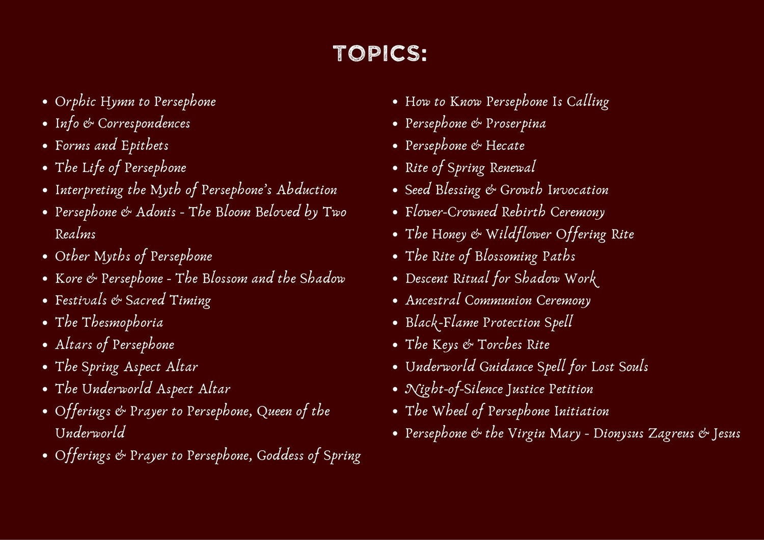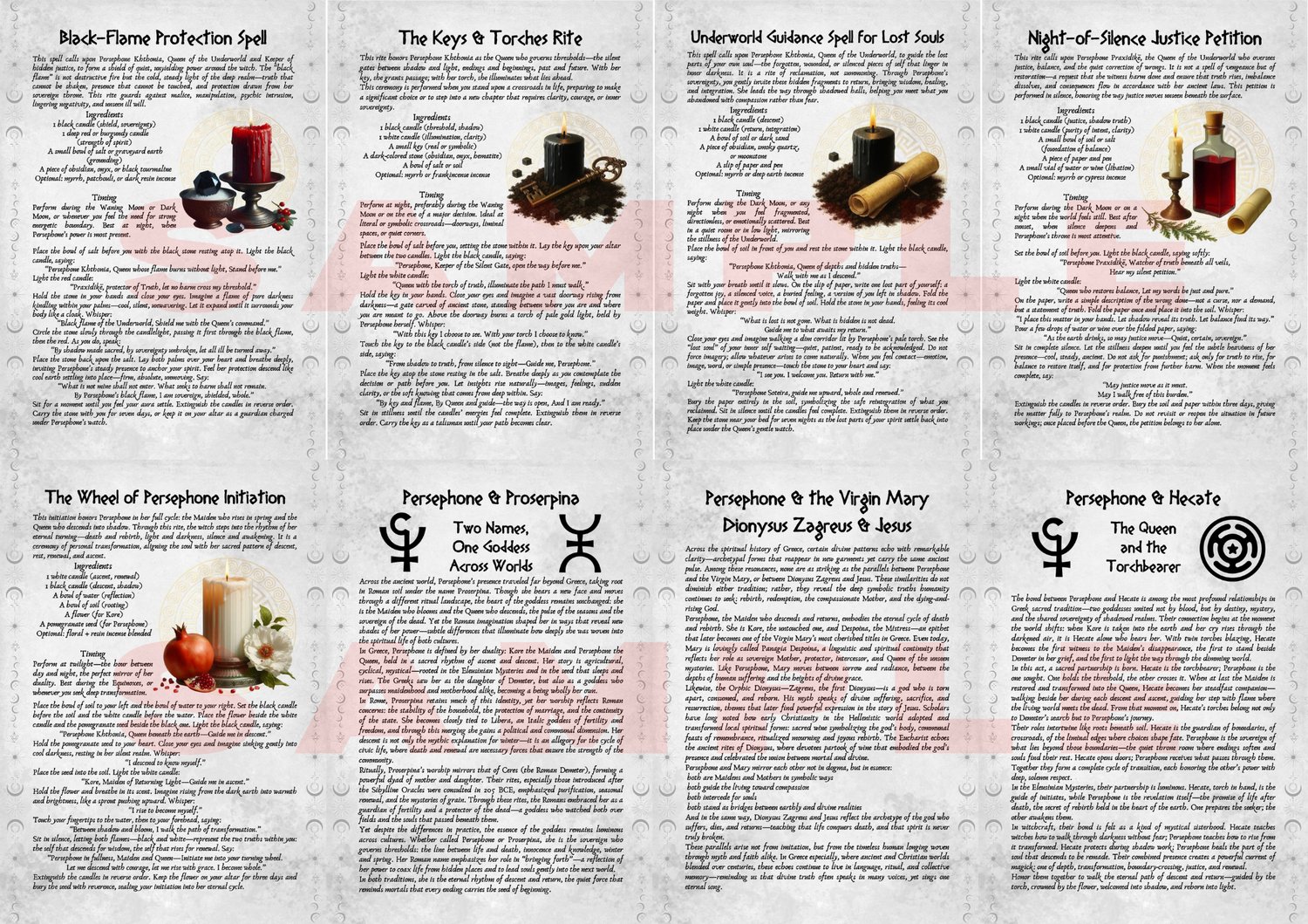Perfect for witches, pagans, Hellenic polytheists, and spiritual seekers, this witchcraft PDF is filled with lore, rituals, correspondences, devotional pages, and powerful rites that honor both Kore the Maiden and Persephone Khthonia.