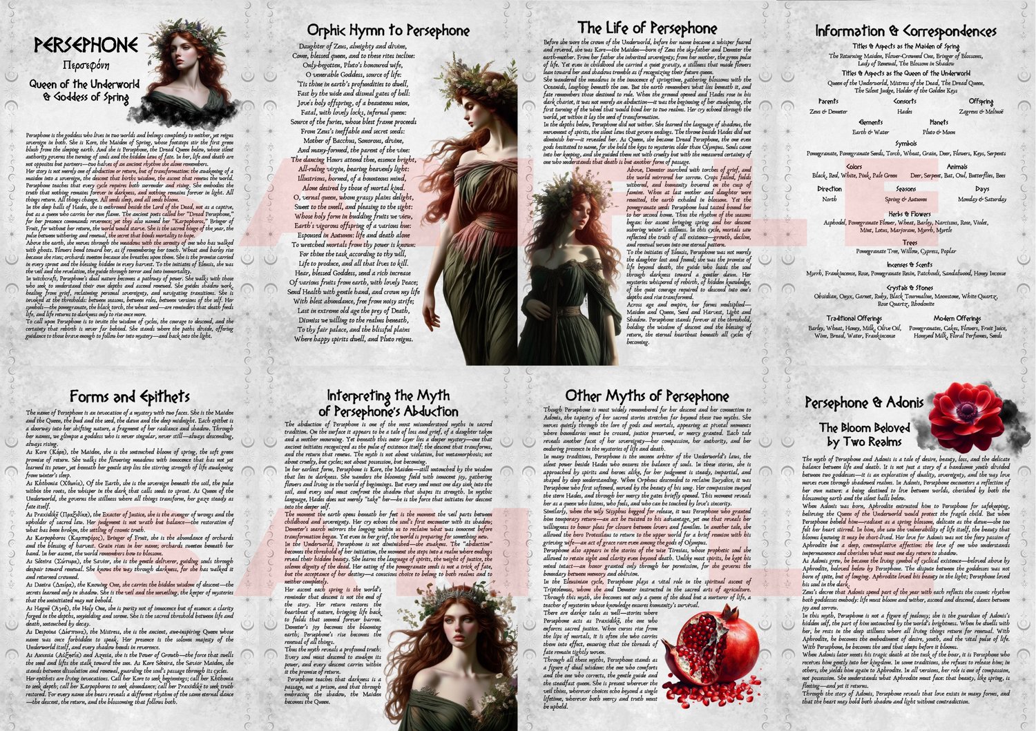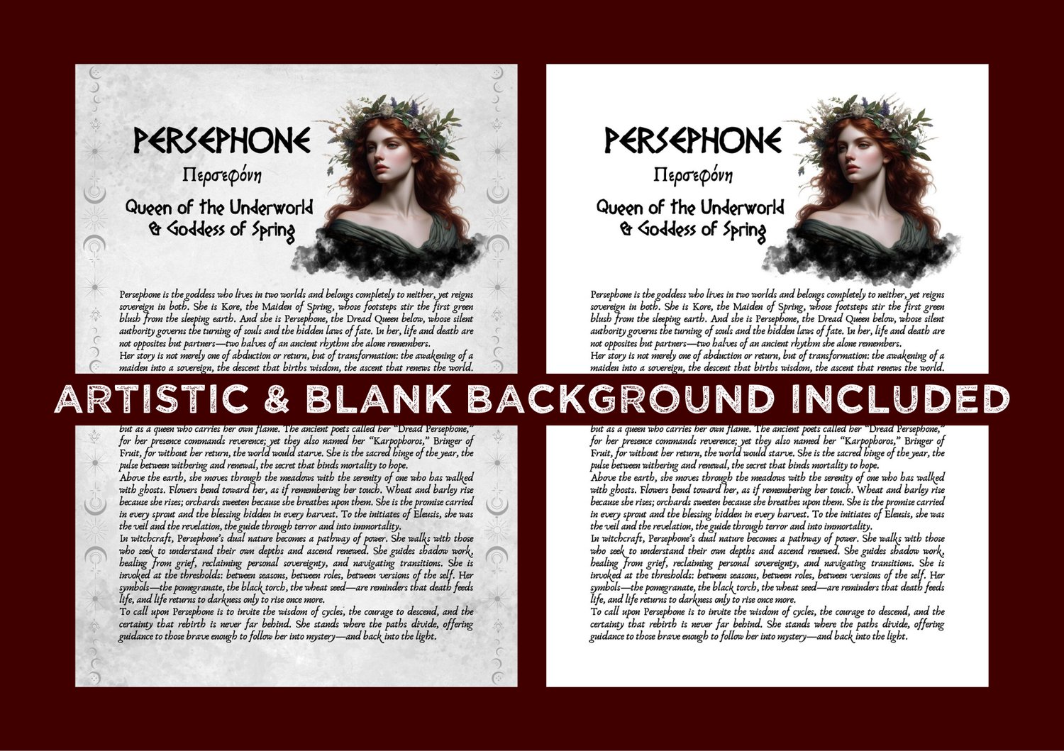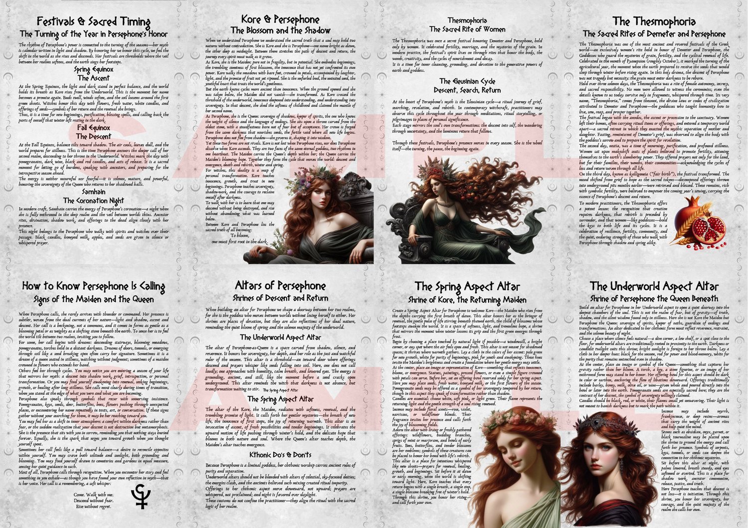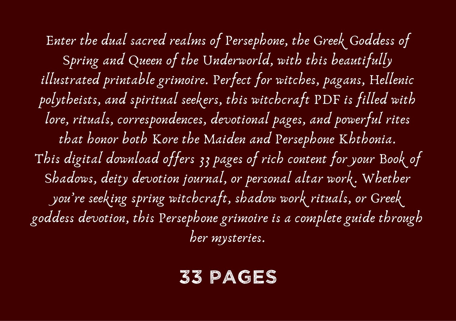 Enter the dual sacred realms of Persephone, the Greek Goddess of Spring and Queen of the Underworld, with this beautifully illustrated printable grimoire.
