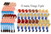 Mother and child dolls. 12 mums, 9 boys, 9 girls. Mum has 4 hair colours, children have 3. All dolls have blue, green or brown eyes.