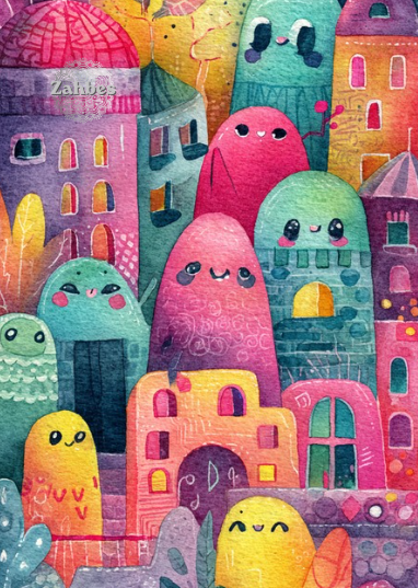 Whimsical Monster City – Watercolor Art Print | Instant Download | Super Deal 16 Sizes