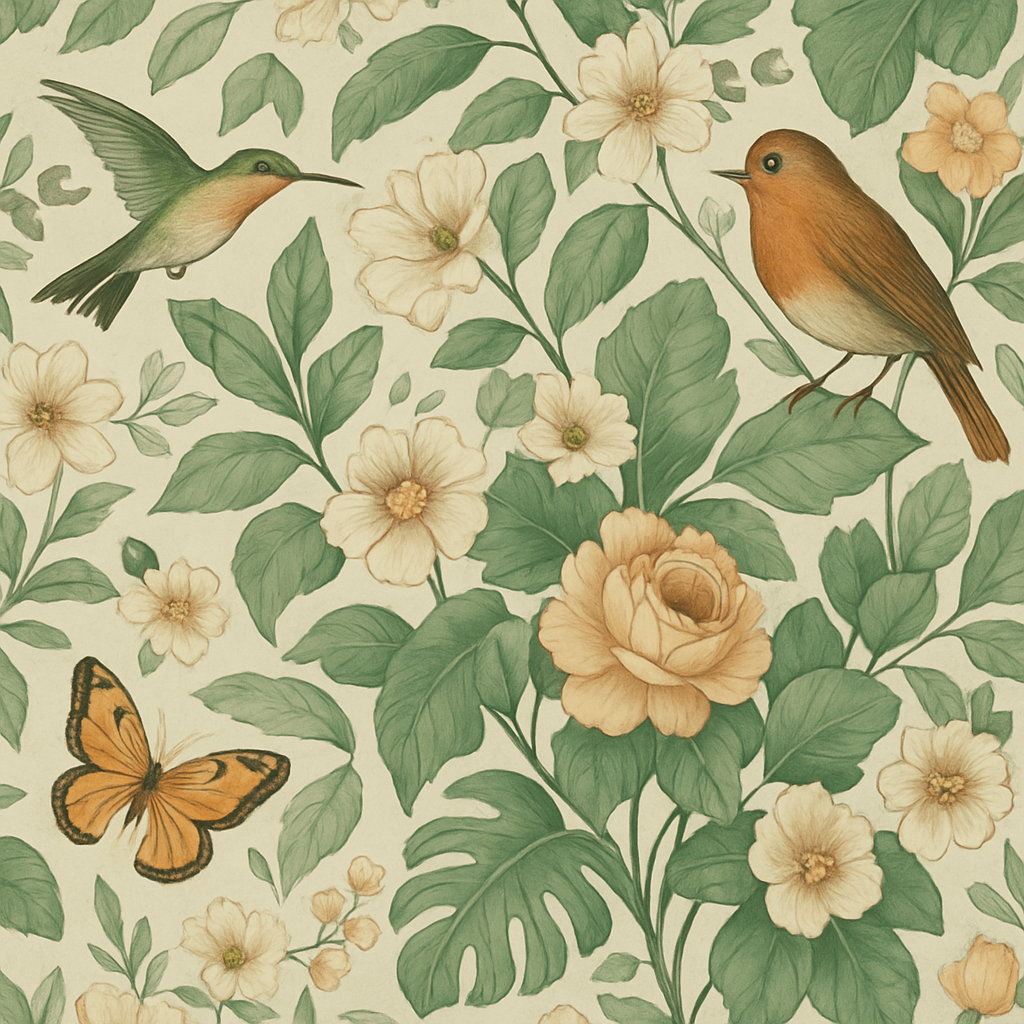 A vintage-style illustration featuring a hummingbird, a robin, a butterfly, and various cream and soft-yellow flowers with lush green leaves. The design is delicate and nature-inspired, evoking a calm, botanical aesthetic.