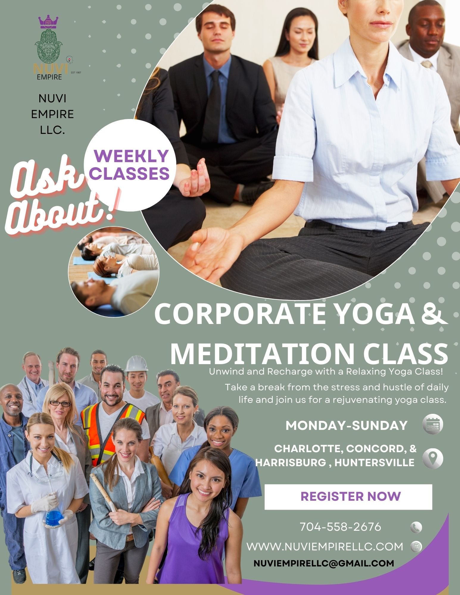 Destress in the Workplace! Relax, Relate, Release "2 Weekly Classes" 6 Month Yoga & Meditation