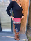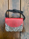 Stay effortlessly stylish with this handmade faux leather hip bag. Designed for comfort and convenience, this sleek bag sits perfectly at your waist, offering hands-free ease while keeping your essentials close. The striking red flap combined with the bold patterned body adds a unique touch to any outfit. With its secure magnetic closure and practical design, this hip bag is both functional and fashionable, making it the perfect companion for your on-the-go lifestyle.